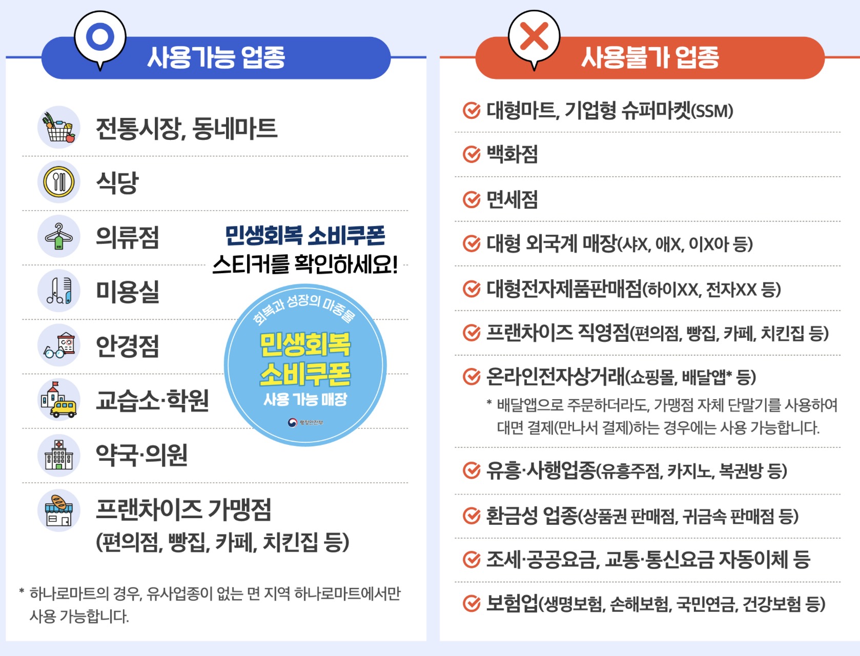 사용가능 업종과 사용불가 업종이 나뉘어져 있으므로 잘 구분할 수 있어야한다. 의외로 안되는 곳들도 꽤 있다.