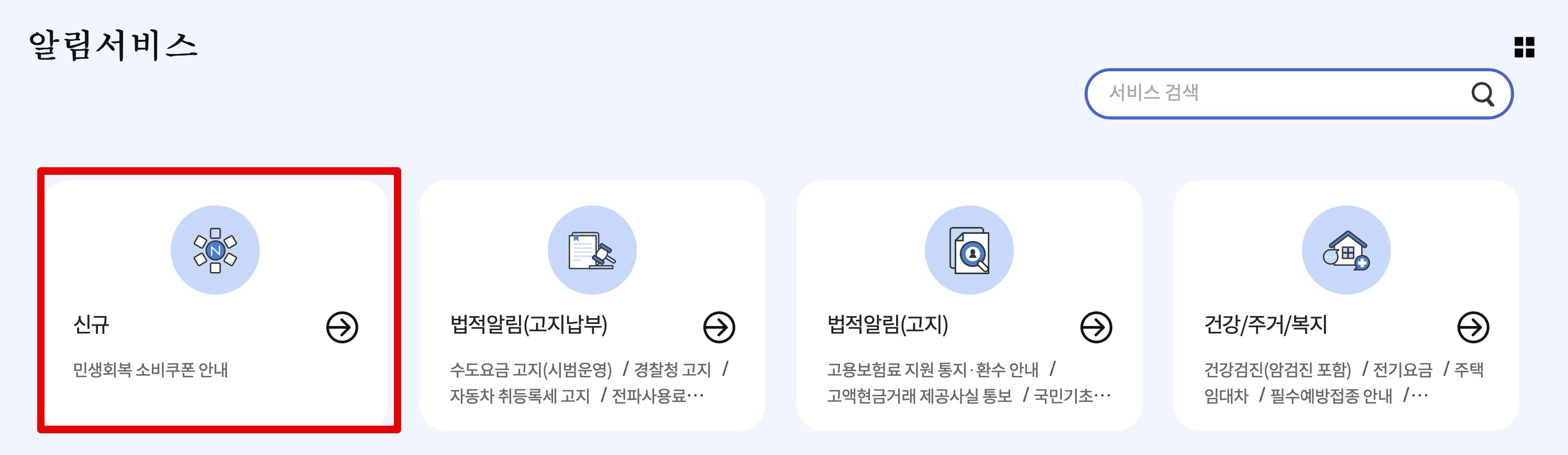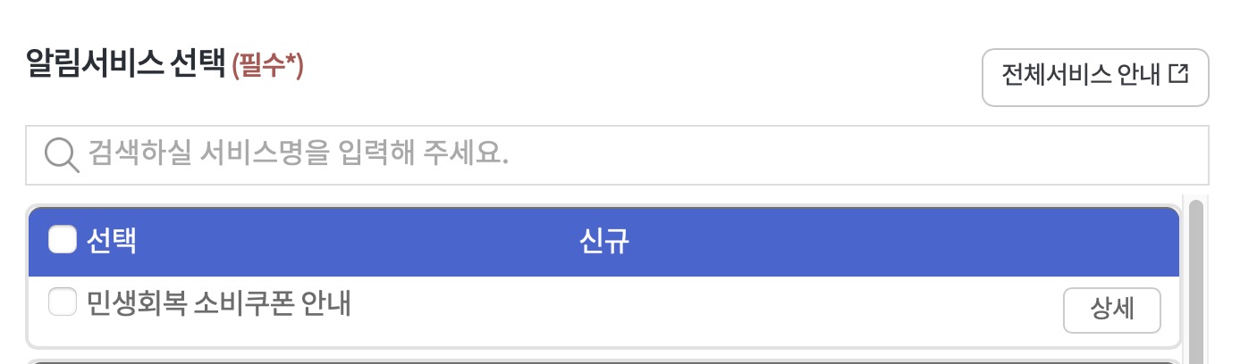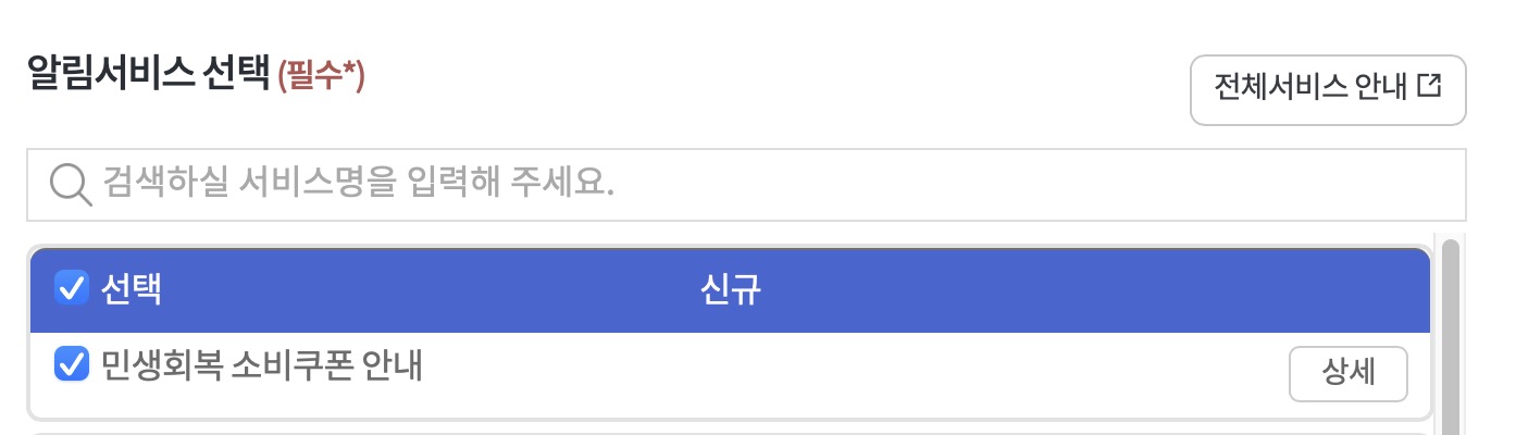 알림서비스 목록에 기존에는 없었던 신규 내용, 민생회복 소비쿠폰 안내 알림 서비스가 등록된걸 볼 수 있다.