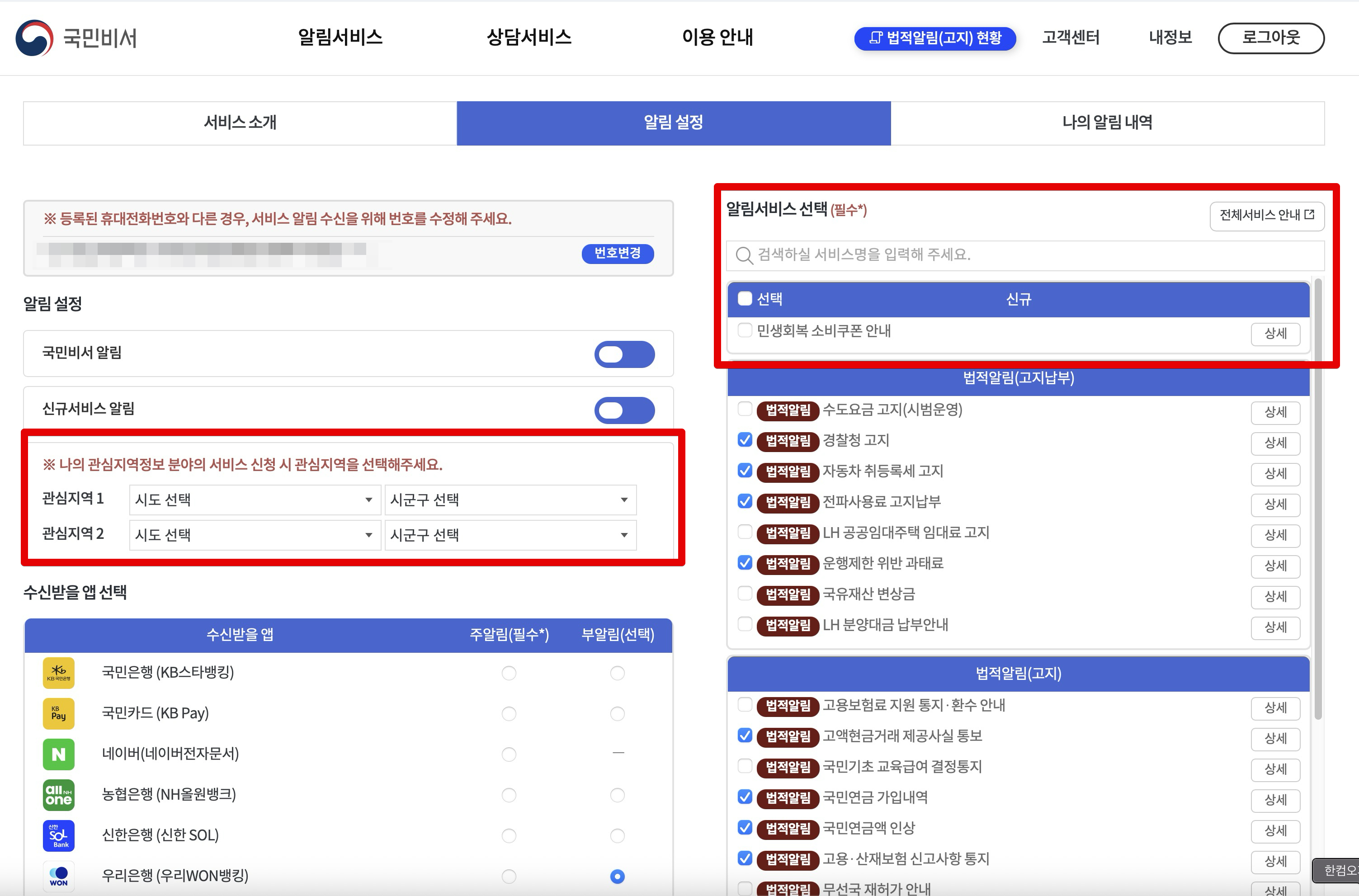 특별히 이번에 새롭게 추가된 민생회복 소비쿠폰 안내쪽을 체크하고 설정해서 아래쪽에서 완료지으면 끝.
