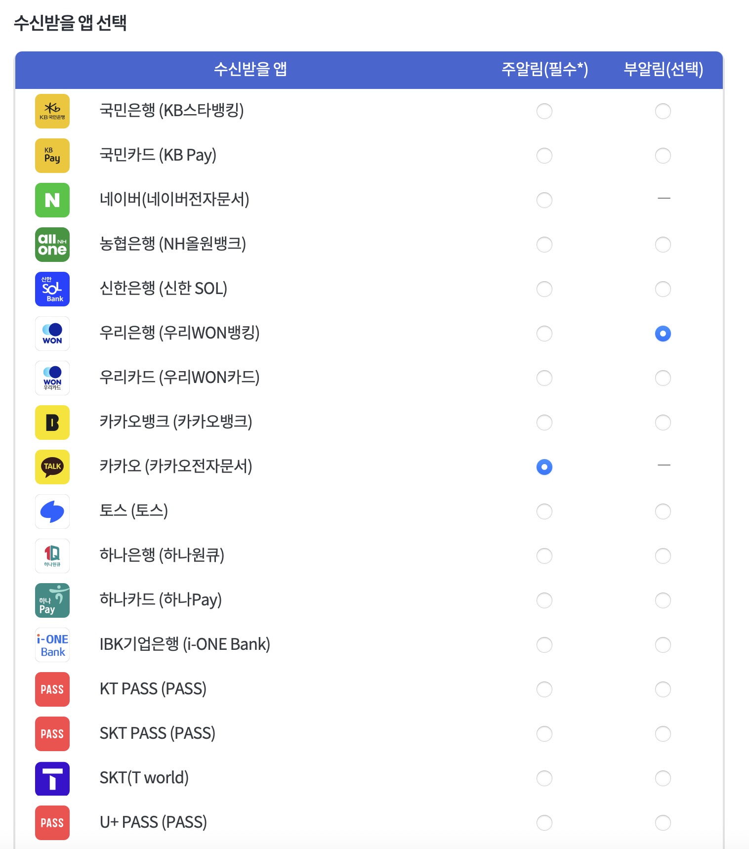 수신받을 앱도 설정해두면 유용하다. 1차 앱은 카카오톡으로 2차 앱은 편한걸로 설정해두면 된다.