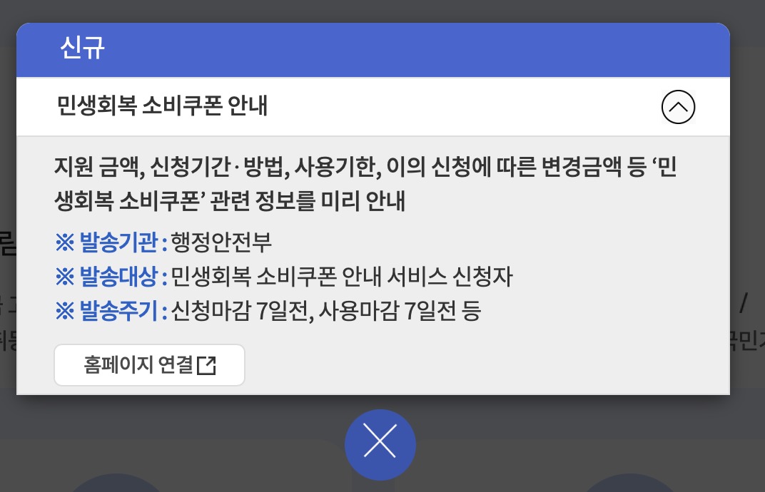 국민비서 앱에서 알림이 왔다. 새로운 신규 서비스 알림 신청이 가능하다는 내용이었다. 신규 신청이 가능한 서비스는 이번에 추진되는 민생회복 소비쿠폰 관련이다.