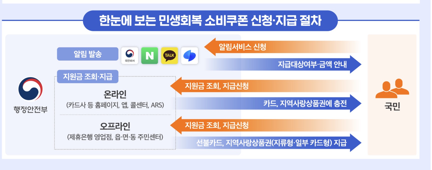 민생회복 소비쿠폰 신청 및 지급 절차는 위 그림과 같다. 일단 제일 먼저 알림서비스를 신청해야한다. 그러면 지급대상여부와 금액 등을 안내받을 수 있다. 다음으로 온라인 또는 오프라인에서 지원금 조회 및 지급 신청을 하고, 이후에 소비쿠폰 금액만큼 충전해줘서 쓸 수 있도록 하는 방식이다.