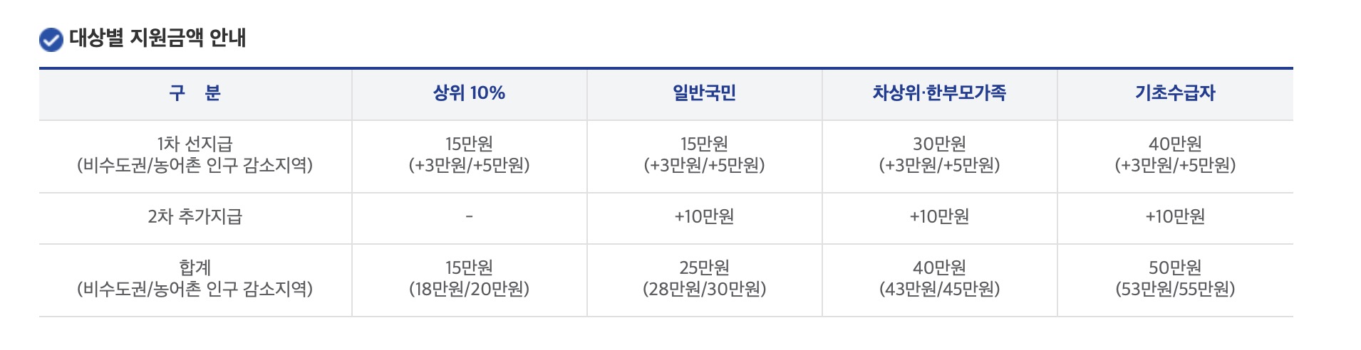 대상별 지원금액 행정안전부 표를 보게 되면, 1차 선지급 금액에 비수도권의 경우 15만원에 + 3만원을 더해준다. 인구감소지역에서는 5만원을 더해준다. 따라서 비수도권에서 1차 금액은 18만원이고 인구감소지역에 거주한다면 20만원이 들어올 것이다. 2차 추가지급금은 10만원으로 동일하다.