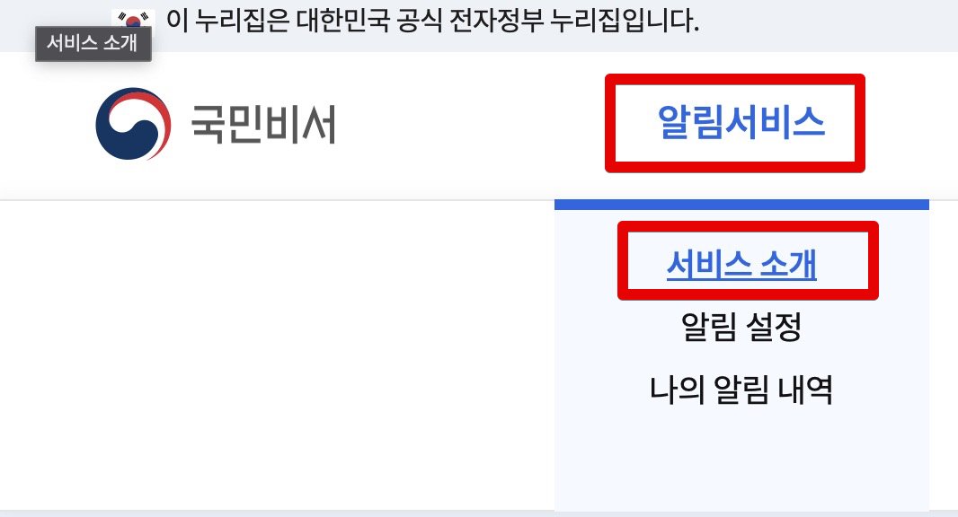 국민비서 홈페이지에 들어간 다음 [알림서비스]에서 [서비스 소개]를 눌러보면