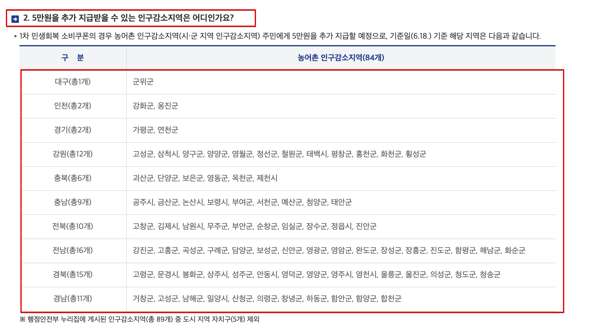 인구감소지역에서는 5만원을 추가로 받을 수 있게 되어 총 30만원을 받을 수 있다. 예를들어 안동시의 경우 다 합하면 30만원의 소비쿠폰이 주어진다. 이 금액은 1차로 주는 금액에 포함돼 있다.