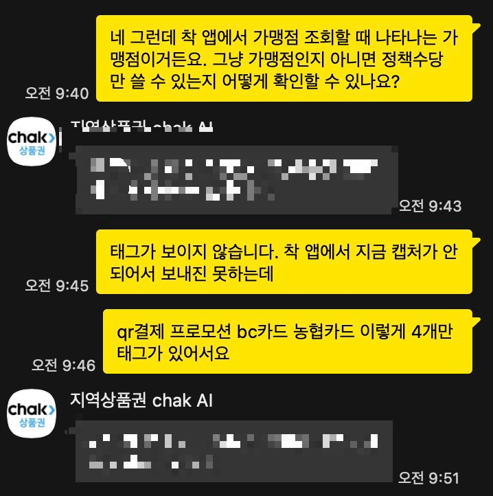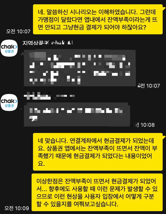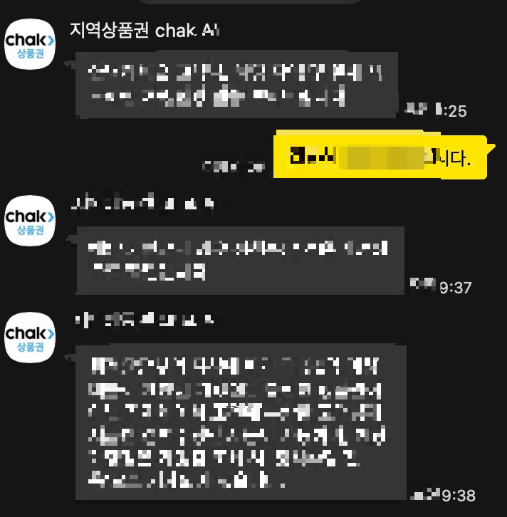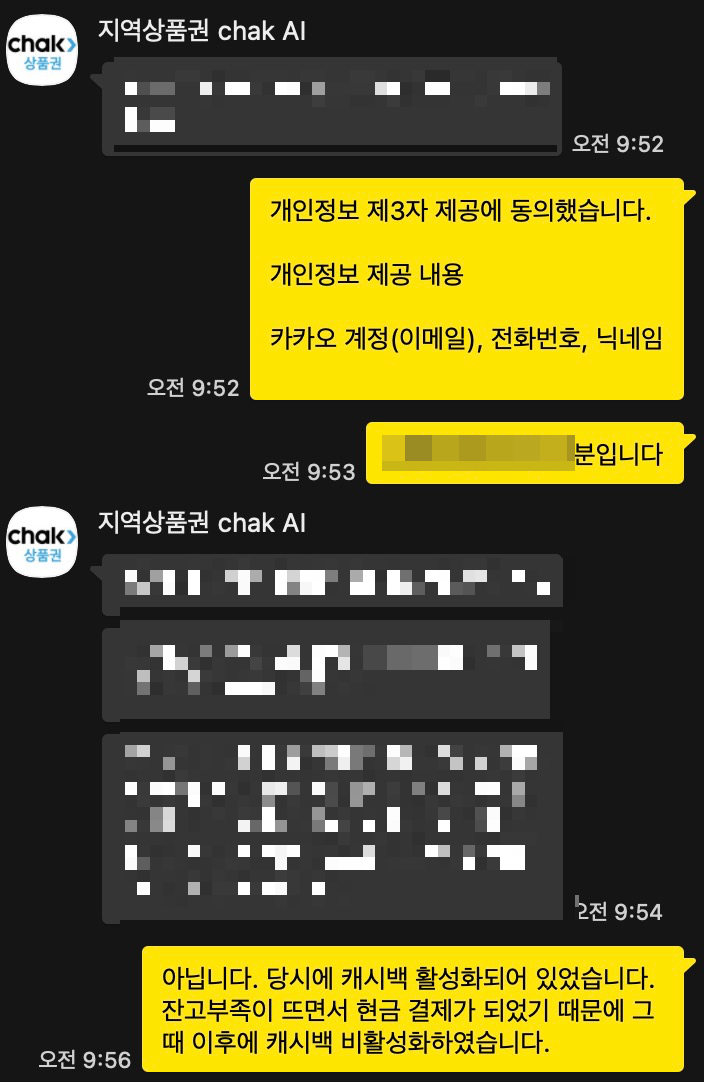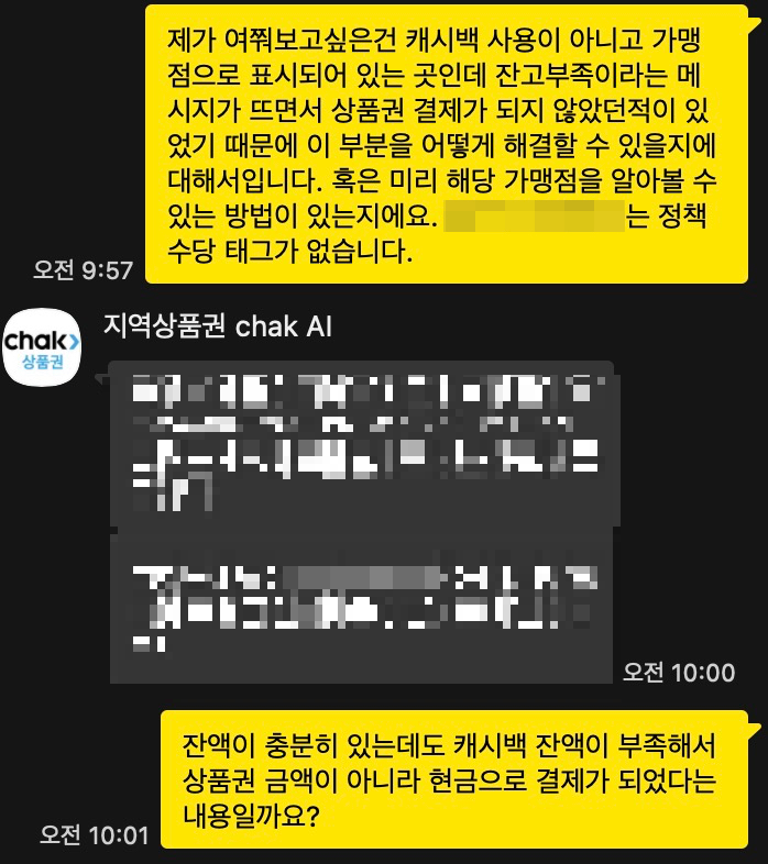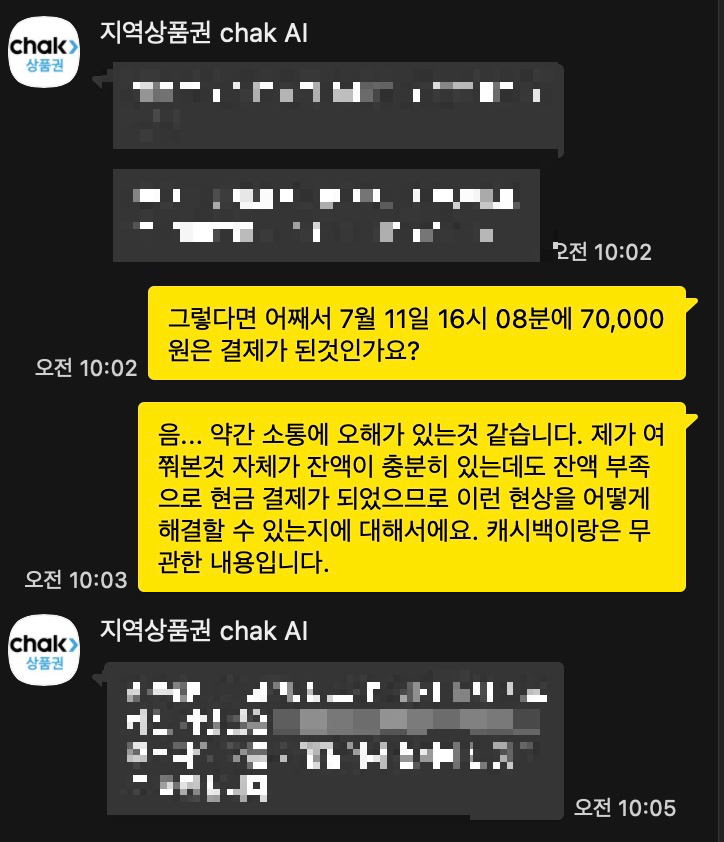 그래서 이런 문제를 해결할 수 있는 방법이 있는지에 대해 알아보고자 지역상품권 chak에 채팅 상담을 하게 되었다. 약 1시간 가까이 상담하였다.