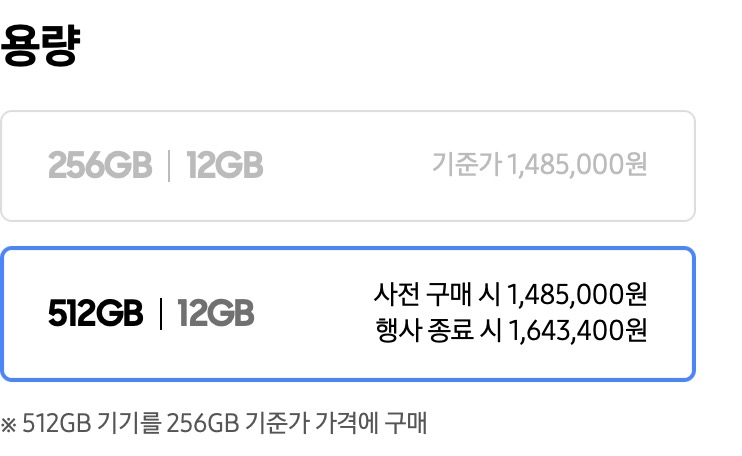 자급제 사전구매라면 용량 선택은 당연히 512GB로 하면 된다. 그 이상부터는 더블스토리지 혜택이 없다.