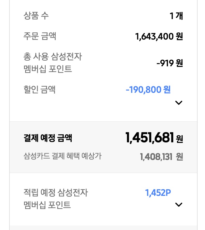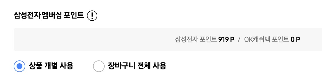 결제 과정에서 삼성전자 멤버십 포인트를 쓸 수 있는데 남아있는 포인트 919원이 있어서 사용했다.ㅋㅋㅋ
