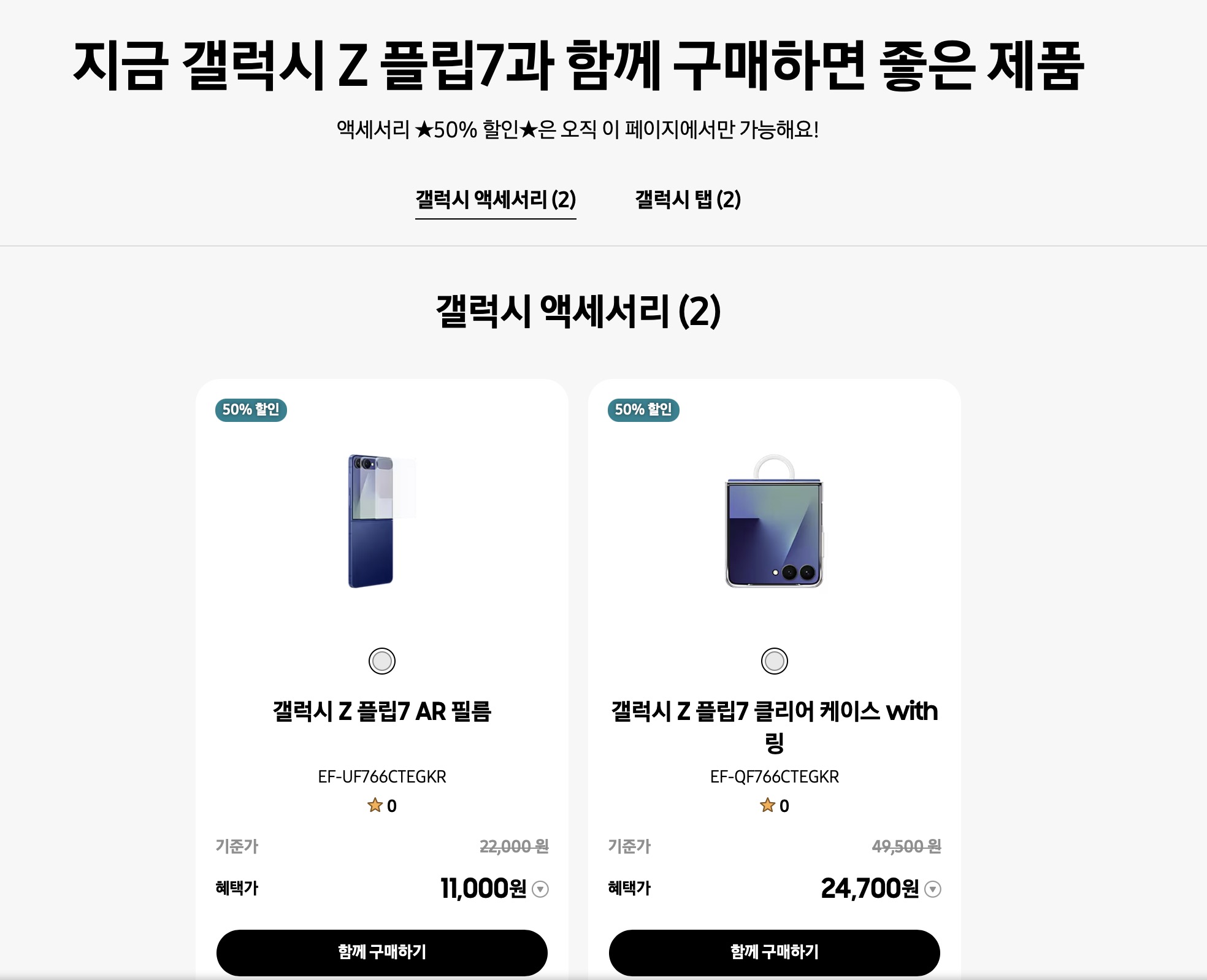 구매창으로 넘어가게 되면 함께 구매하면 좋은 제품들을 할인해주는 창이 나타난다. 갤럭시 악세서리 2종이 50% 할인된 가격으로 제시된다. AR 필름과 클리어케이스 with 링이 있는데 나에겐 둘 다 필요하지 않다. 나는 이번 폰은 케이스와 필름 없이 사용하려고 생각 중이다.