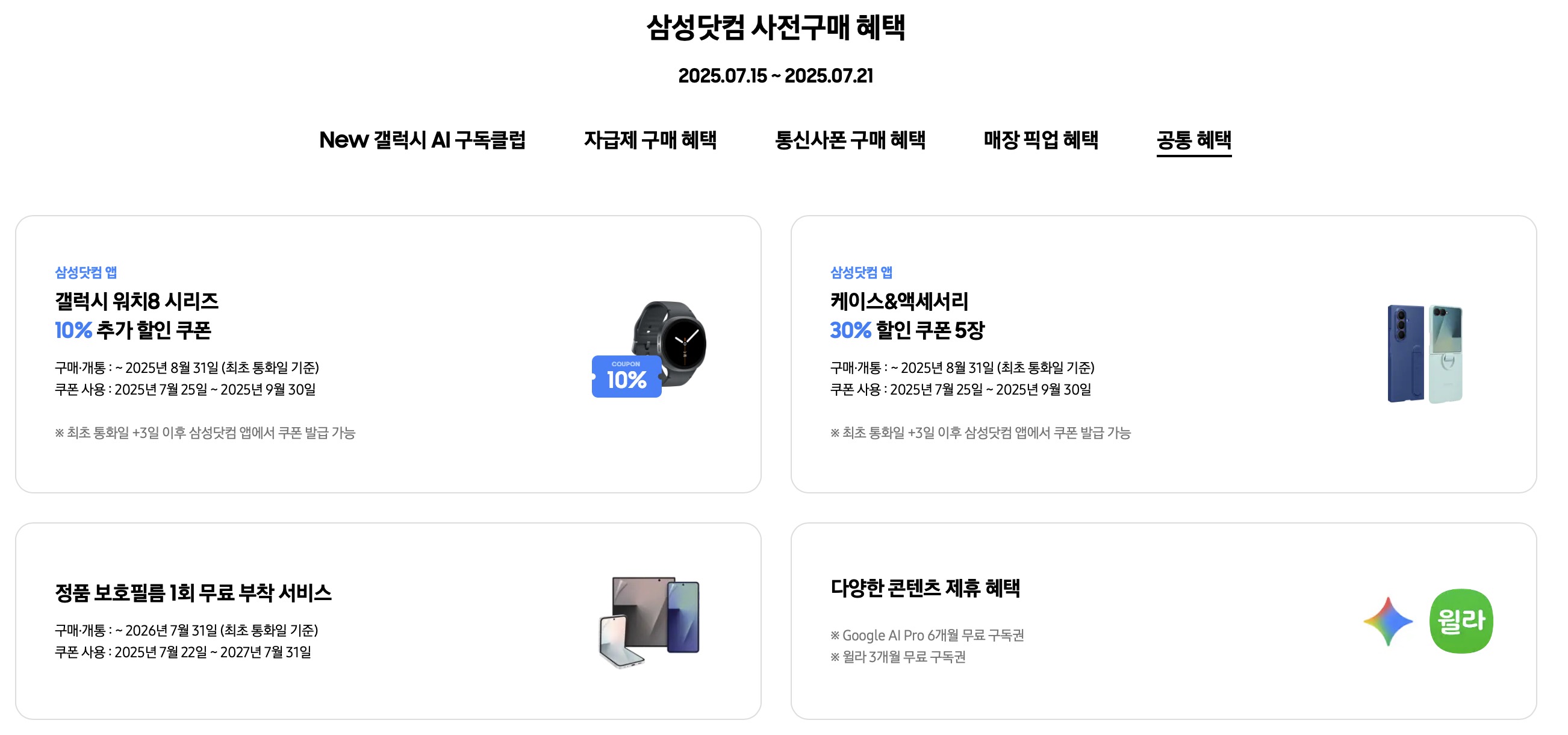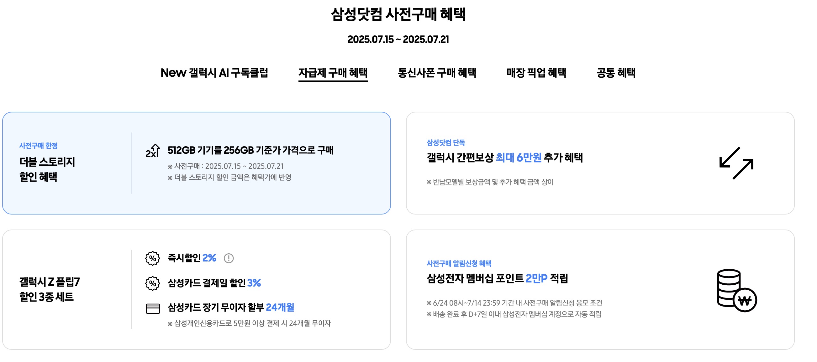 이번에 삼성에서 새롭게 출시하는 갤럭시 Z플립7 사전예약구매 기간이 시작되어서 사전구매 신청 및 결제를 진행하게 되었다. 자급제로 구매하였는데 다양한 할인 옵션들이 있고 삼성카드 3% 청구할인도 있어서 받을 수 있는 만큼은 최대치의 할인을 챙겨서 사전구매해주면 되는 방식이다.