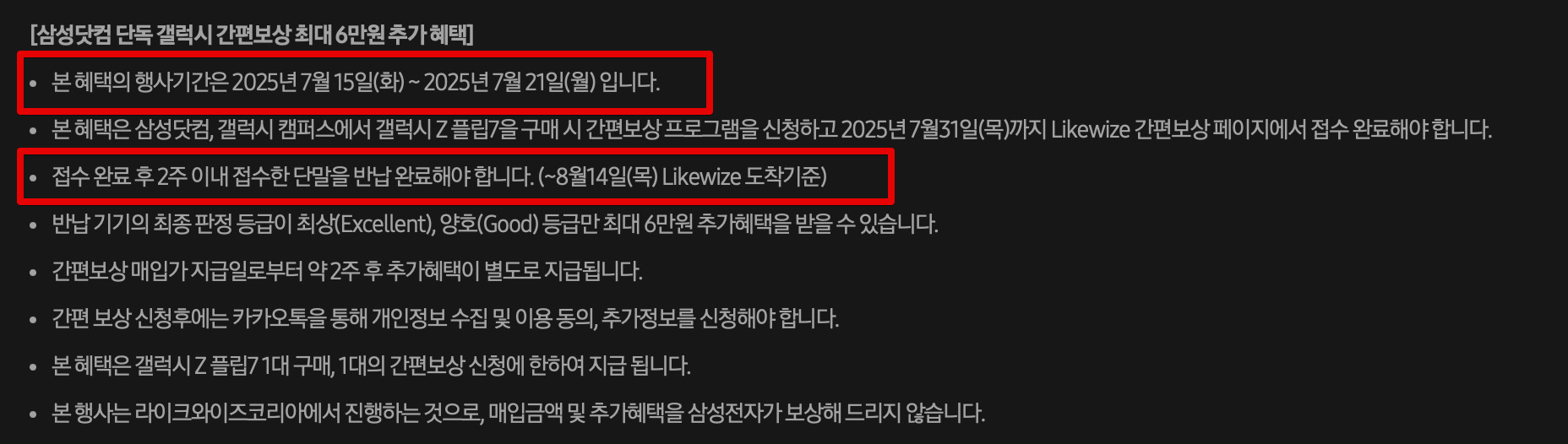 간편보상 혜택을 받으려면 사전구매할 때 신청에 체크해야하고, 이후 7월 31일까지는 접수를 완료해야한다. 민팃 반납일 것으로 예상되므로 보상 과정 자체는 쉬워보인다.
