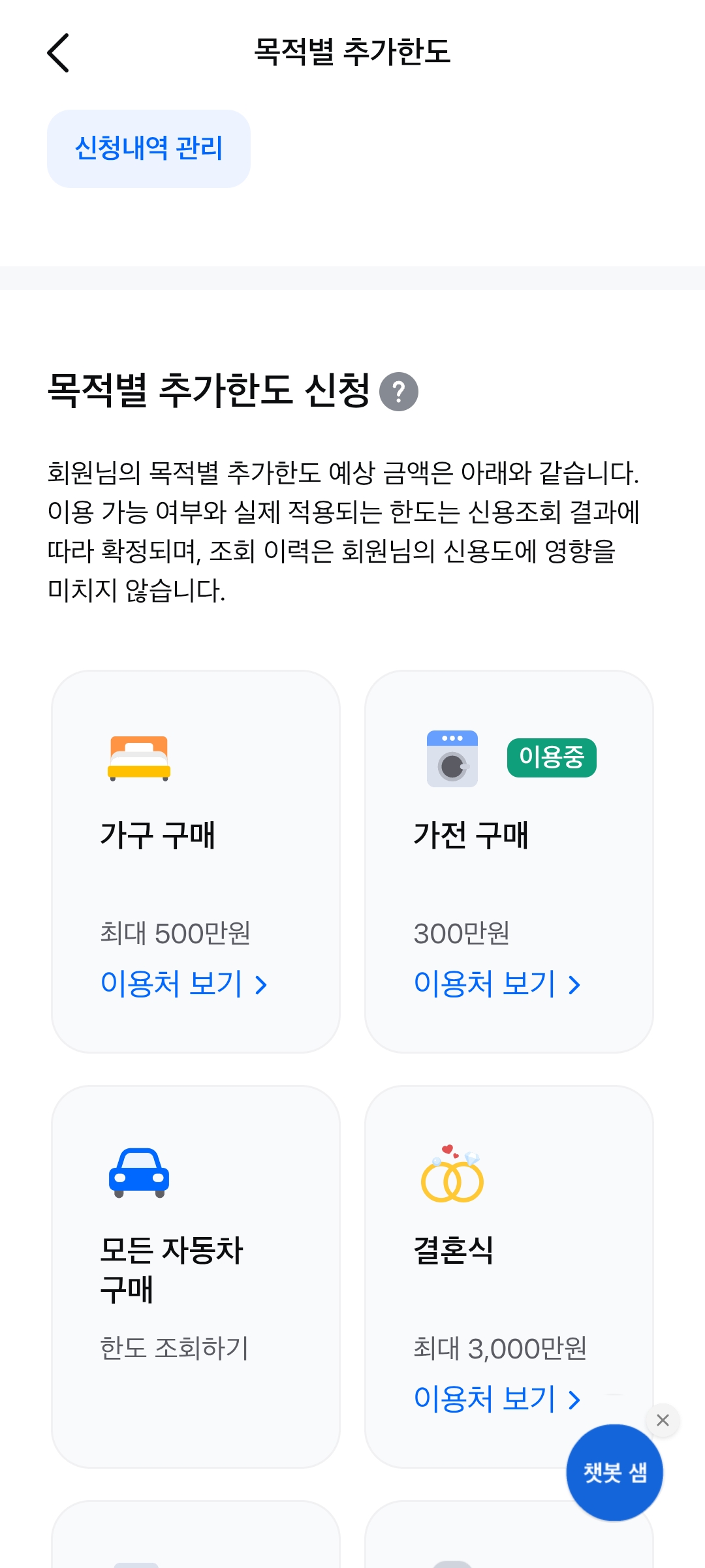 삼성카드는 재미있게도 카드 한도에서 전체 한도가 아니라 목적별 추가한도라는게 있다. 삼성카드로 뭔가를 살 때 그 목적에 맞게 한도를 따로 설정하는 기능인데 유용하다. 예를들어 가전 구매를 할 때에만 일시적으로 한도를 늘려서 결제할 수 있는 방식이 있다. 예를들어 가전 구매 한도를 300만원으로 올려두면 가전 구매할 때에만 300만원의 한도를 쓸 수 있는 식이다.