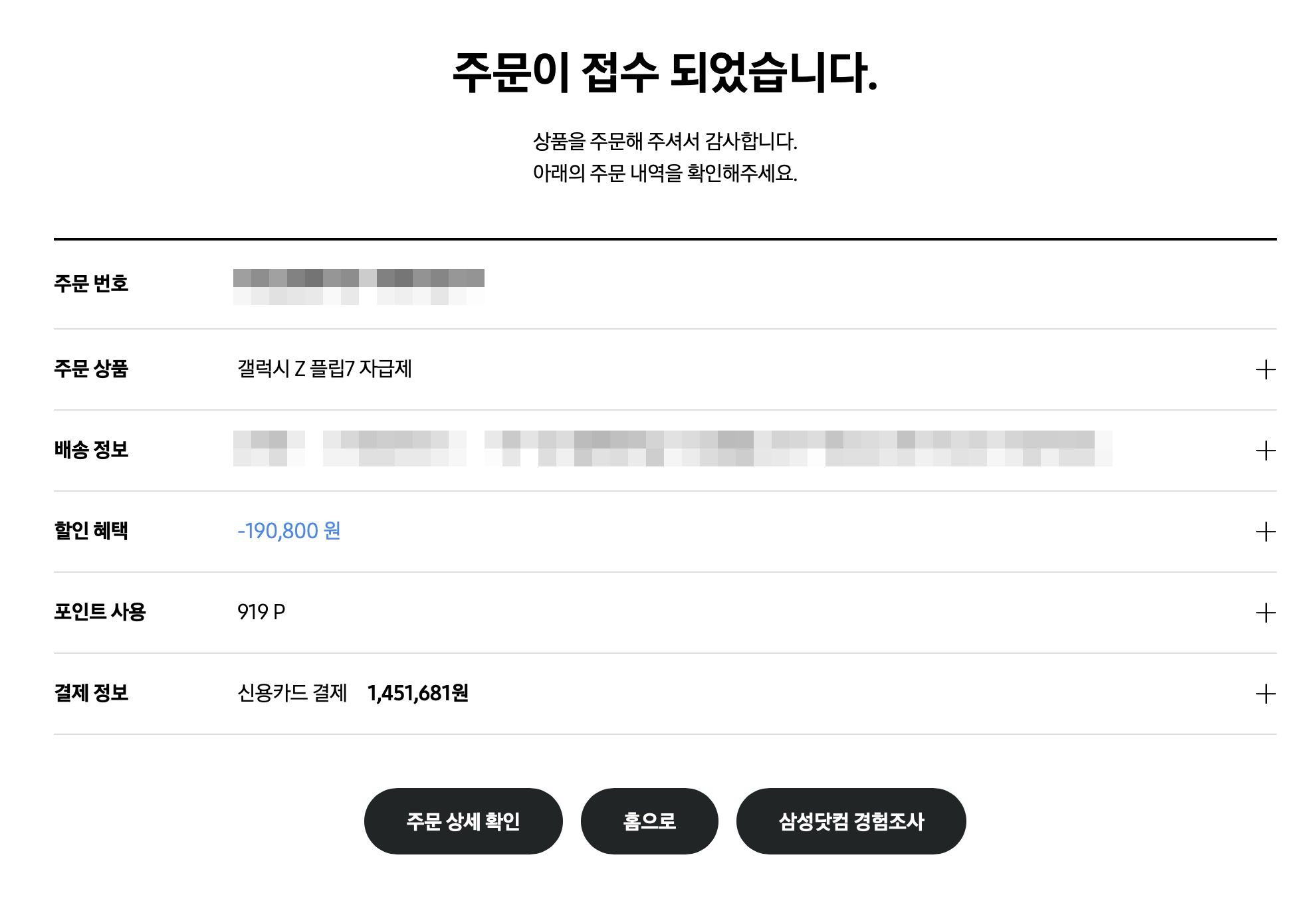 삼성닷컴 구매를 할 땐 삼성카드로 결제를 하게되면 청구할인을 해주기 때문에 삼성카드로 결제하는게 유리하다. 무이자 할부도 받을 수 있다. 나는 할부하지 않고 일시불로 진행하였다. 삼성카드의 경우, 삼성스토어에서 구매할 땐 베네핏 카드를 발급받은 뒤 결제 진행하는 형식으로 하게되면 좀 더 많은 혜택이 있을 수 있다. 실제로 Z플립5를 구매할 때 이런식으로 하였다.