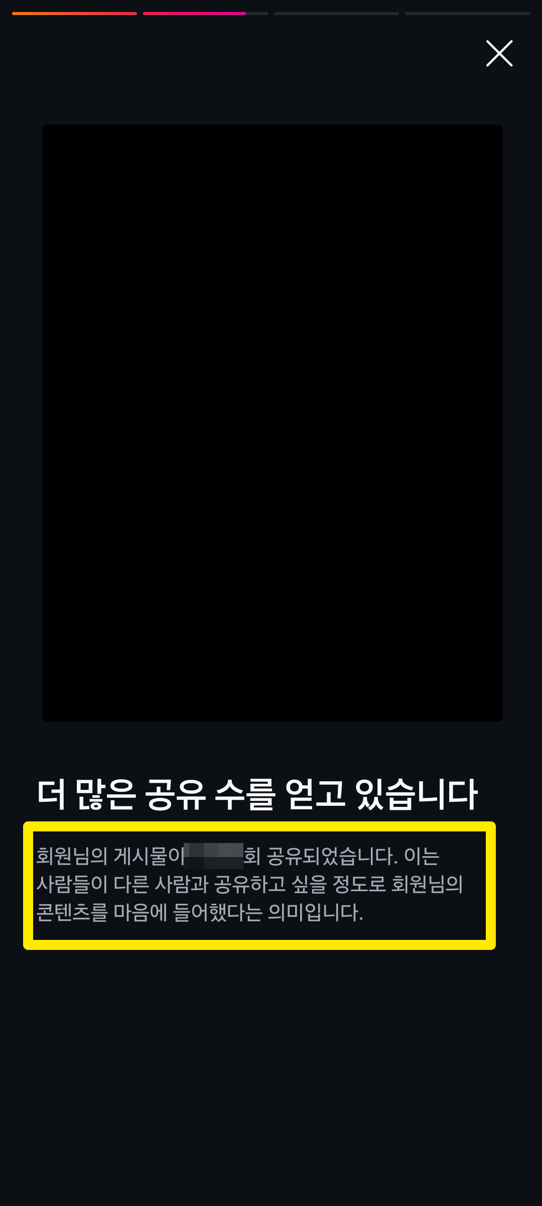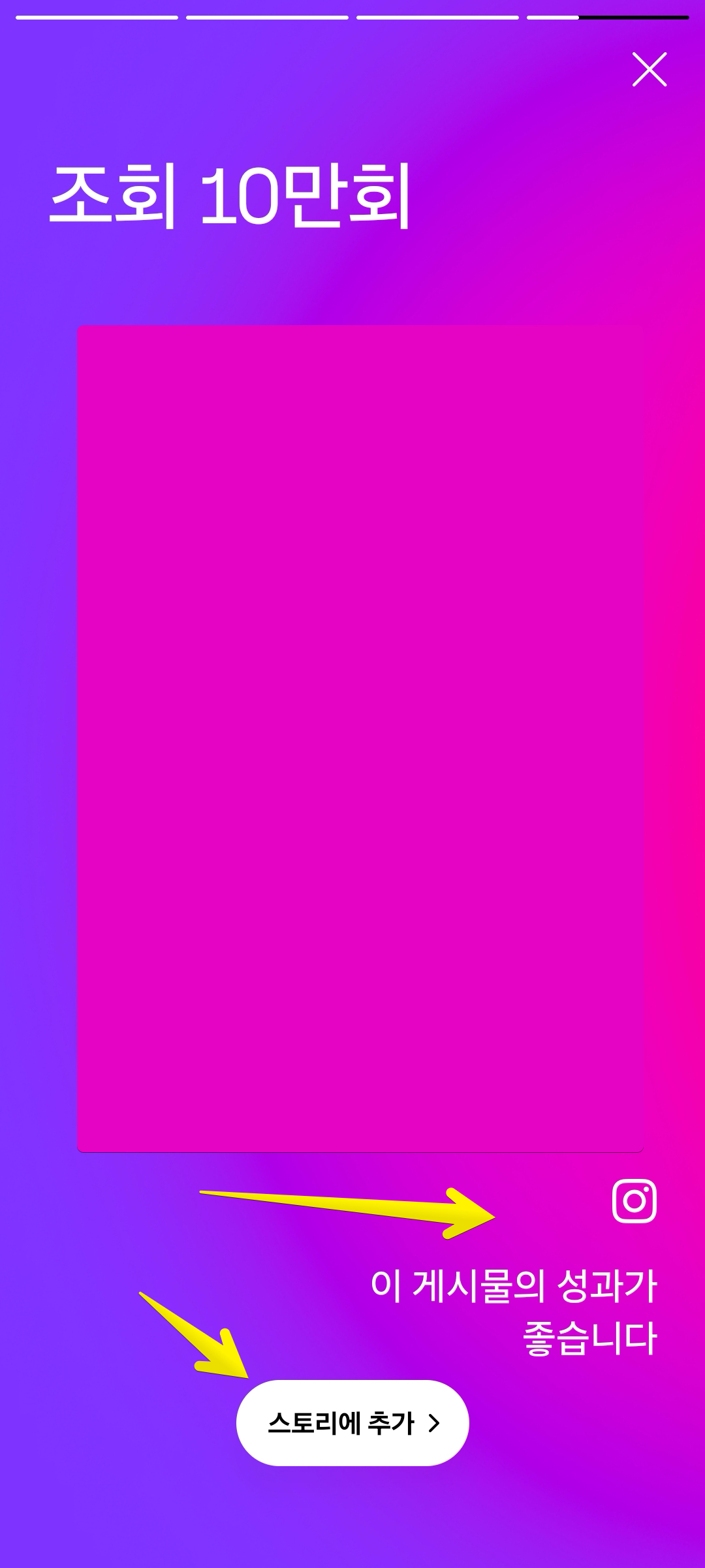끝으로 조회수 10만회를 달성 기념을 스토리에 공유할 수 있는 기능이 추가되었다. 이렇게하면 구독자들과 팔로워들도 해당 게시물의 조회수 10만회 기념 스토리를 볼 수 있으므로 더욱 참여하고 싶거나 소식을 들을 수 있도록해서 친근감을 유도할 수 있다.