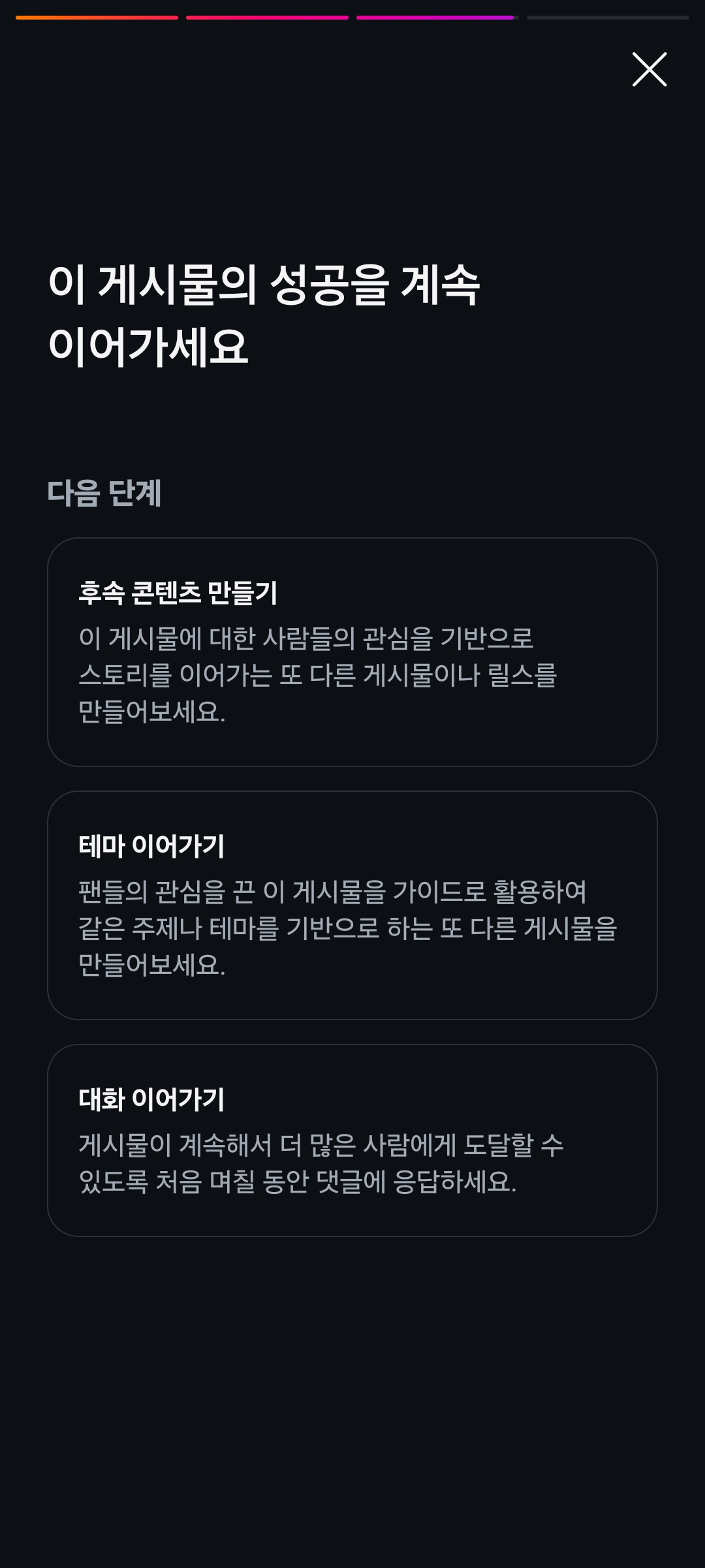 3번째 탭에서 인스타그램에서 공식적으로 추천하는 콘텐츠 제작 TIP이 나타난다. 총 3가지가 제시되는데 첫번째는 인기 있는 게시물의 후속 콘텐츠를 만드는 방법이 있다. 사람들이 재미있어하고 공유를 많이해서 조회가 많이 된 콘텐츠의 후속 콘텐츠는 인기를 이어갈 수 있다. 두번째는 테마를 이어가는 방법이 제시되었다. 팬들의 관심을 끈 게시물을 기준으로 테마화해서 또 다른 게시물을 만드는 방법이다. 세번째는 대화를 이어가는 방법인데 특히 게시물이 계속해서 더 많은 사람들에게 도달할 수 있도록 처음 며칠 동안은 댓글에 응답하라는 TIP이 제시되었다. 이 부분은 사용자인 우리가 주목해서 써먹어볼만한 방법이다.