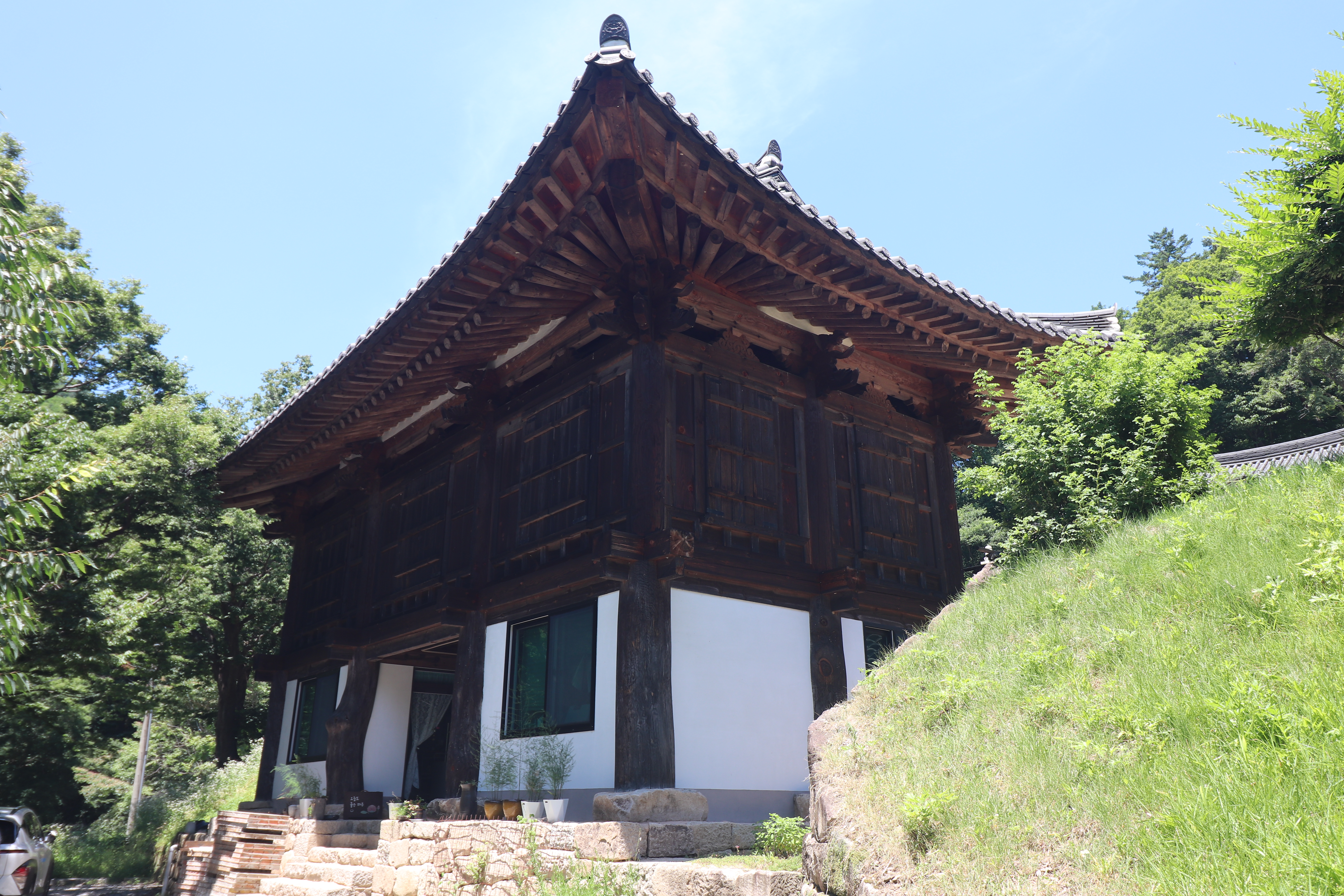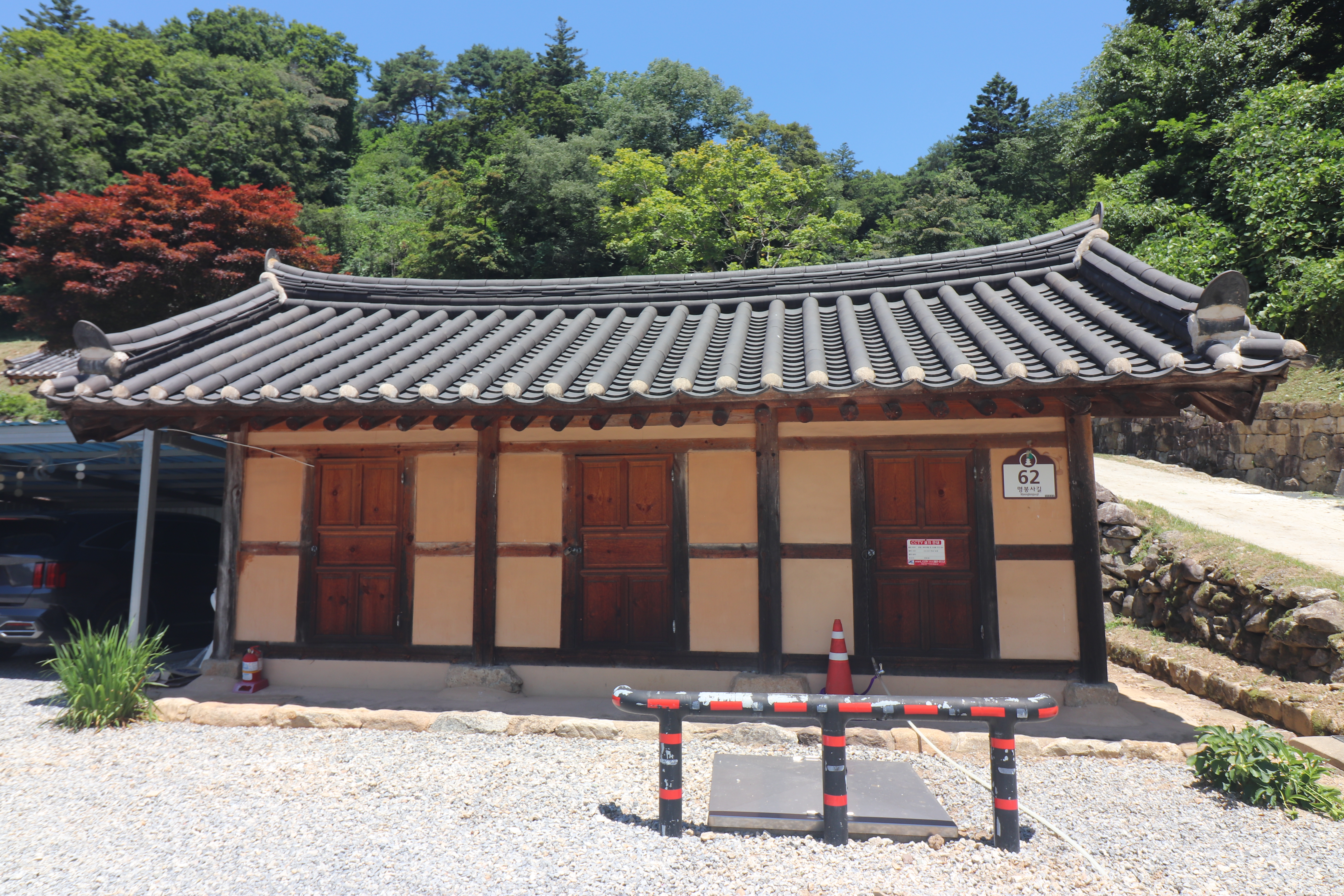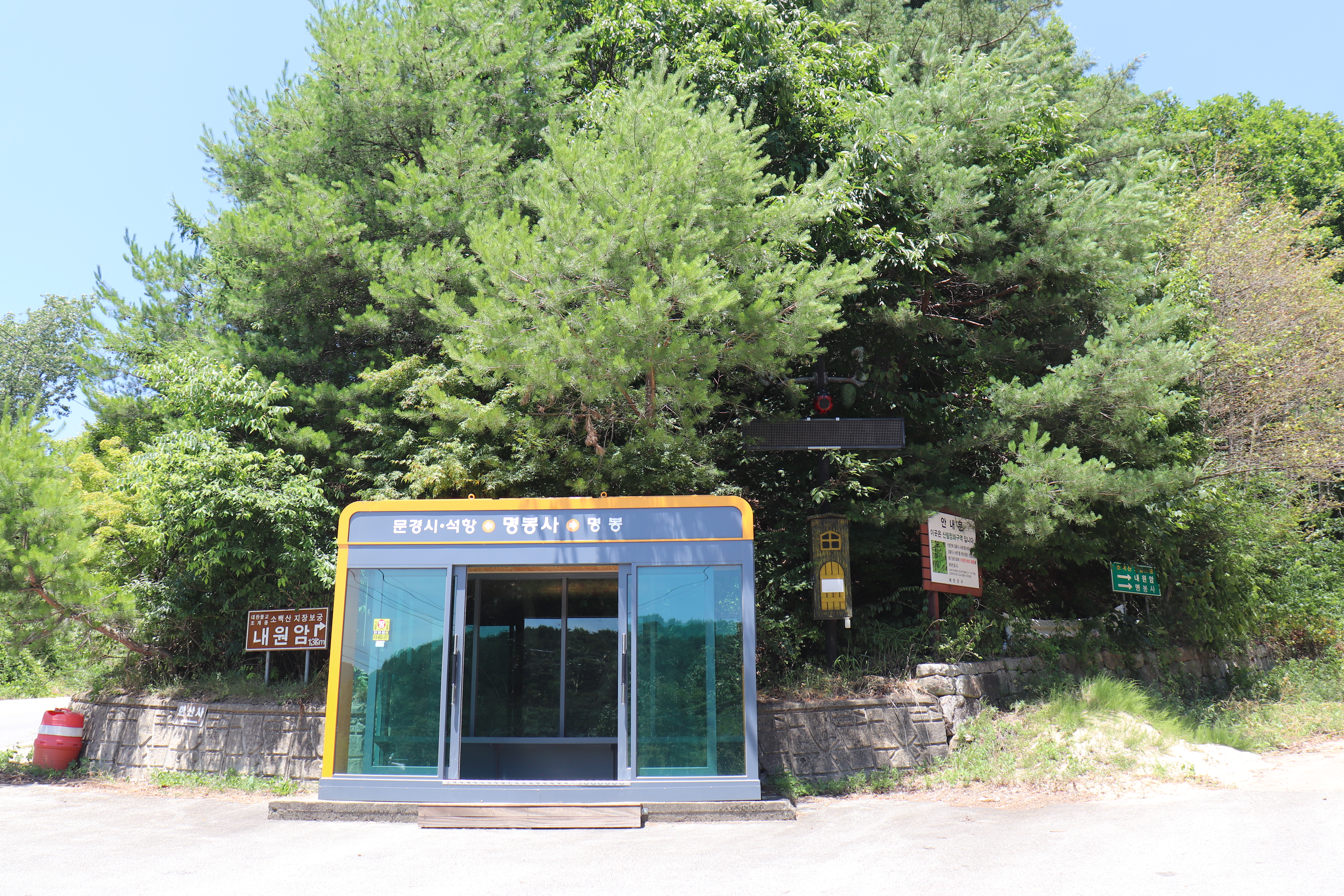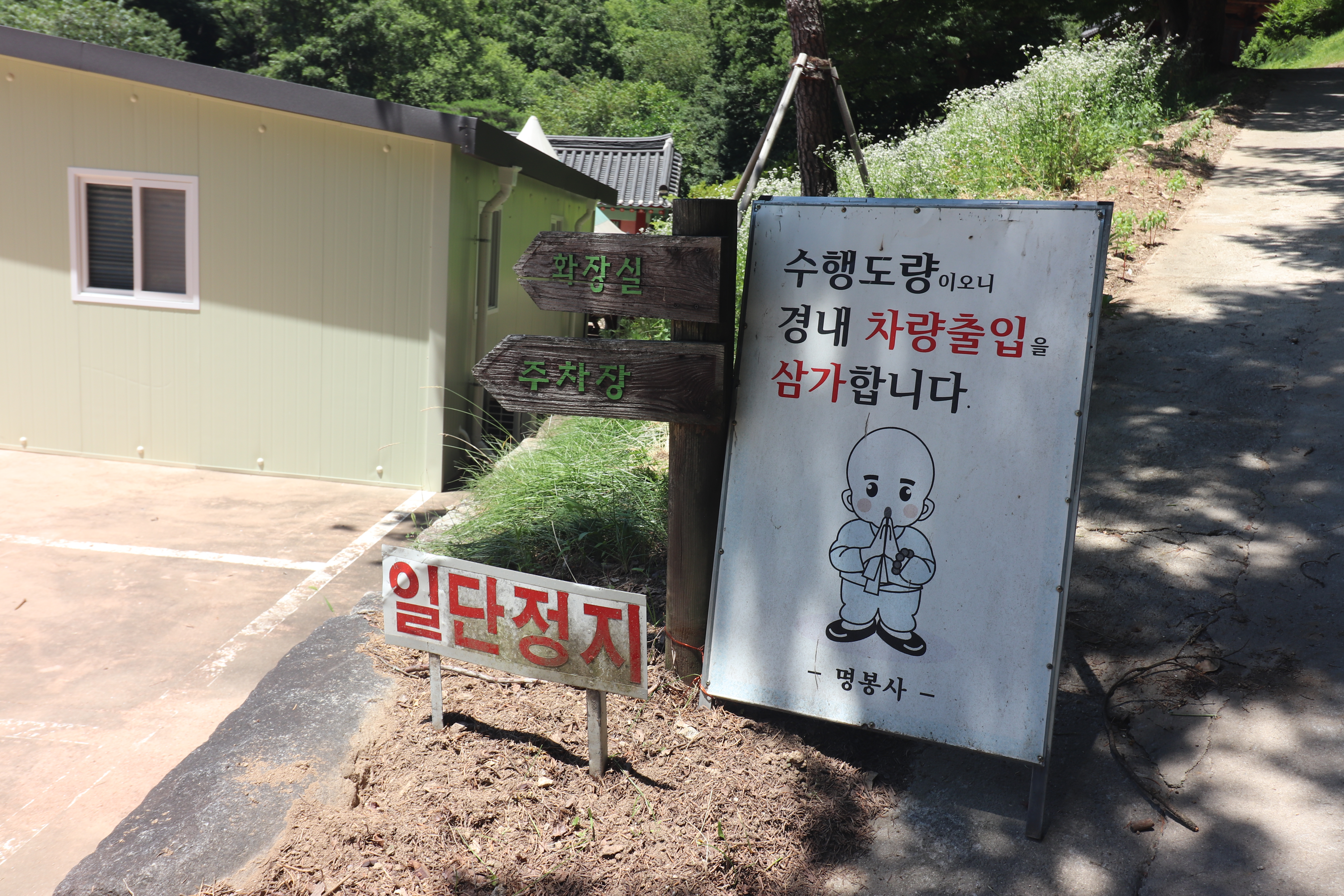 예천읍에서 차로 30분 정도 소백산 쪽으로 들어가다 보면 효자면 명봉리에 명봉사가 있습니다. 가는 길에서부터 나무들이 우거져 있어서 보기만 해도 시원해지는 곳인데요. 7월 무더위에 에어컨 없이 차를 탈 수 없는 날씨였는데, 산으로 들어갈수록 공기가 달라지는 게 느껴지는 곳입니다.