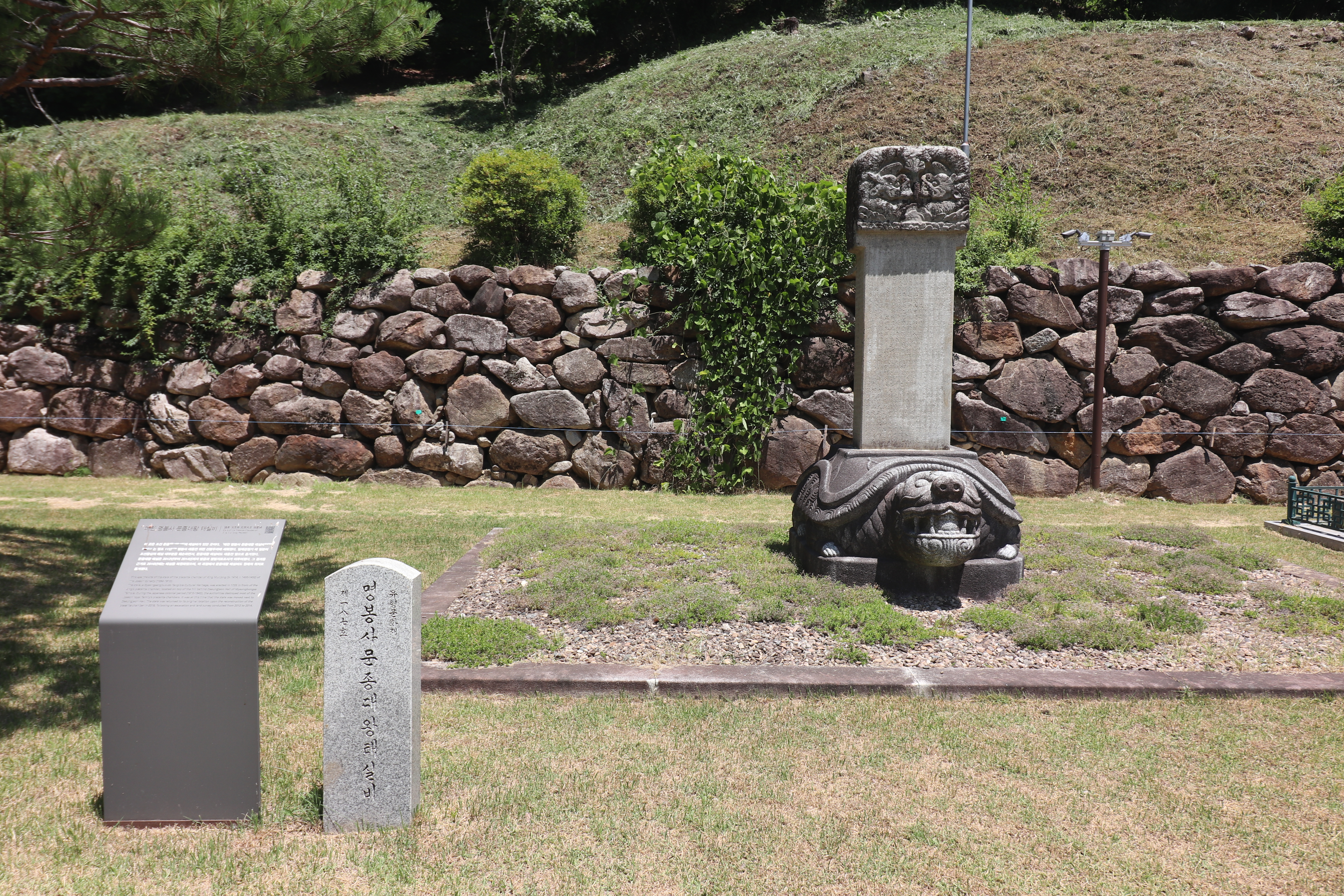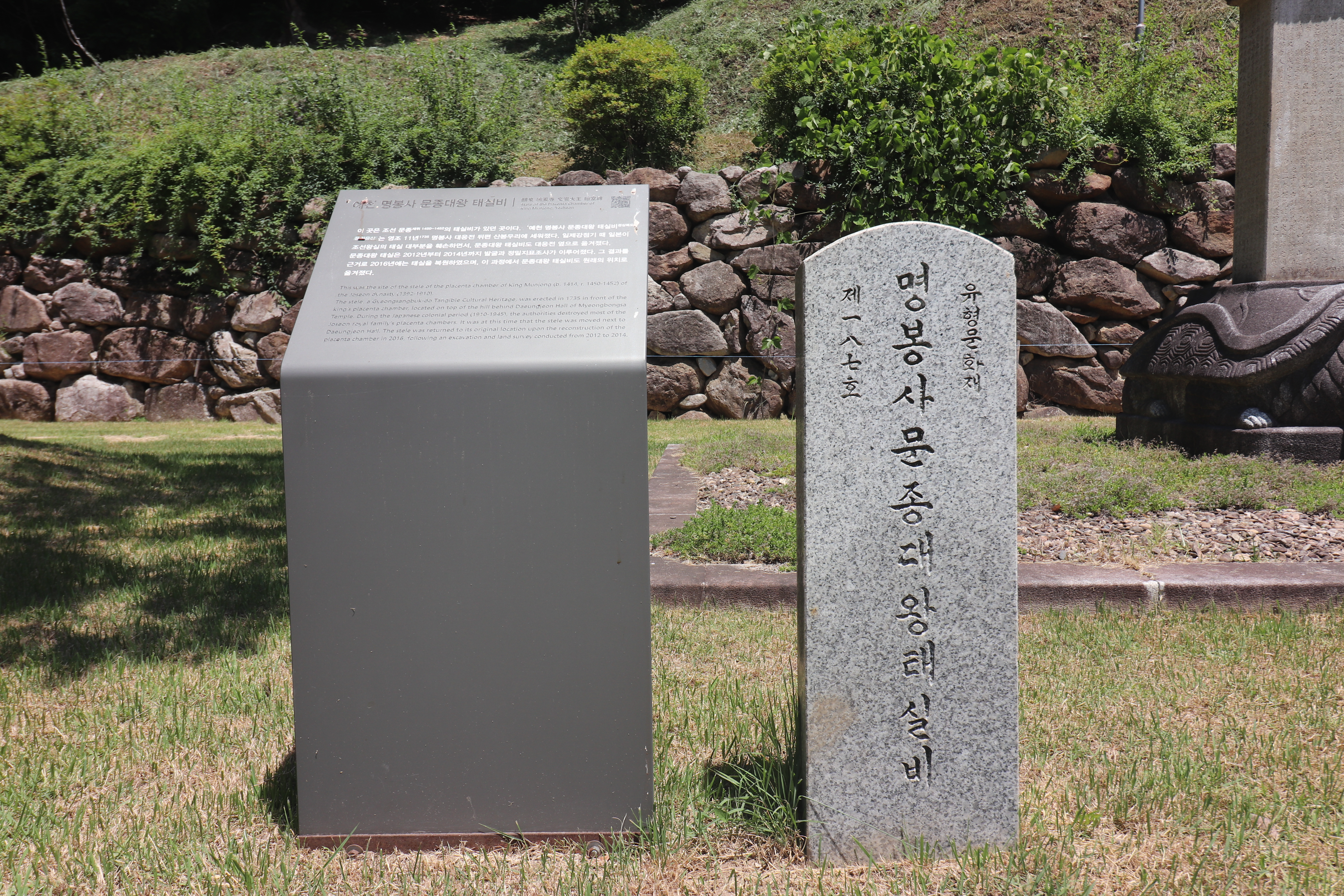 명봉사에서 신기하게 볼 수 있는건 '명봉사 문종대왕 태실비'입니다. 조선 문종의 태를 보관했던 태실을 기념하는 비석인데, 용머리 거북받침돌이 여의주를 물고 있는 모습이 정말 정교한 모습을 갖추고 있습니다. 원래는 절 뒤편 산봉우리에 있었는데 일제강점기에 태실을 발굴한 후 승려들이 경내로 옮겨왔다고 합니다.