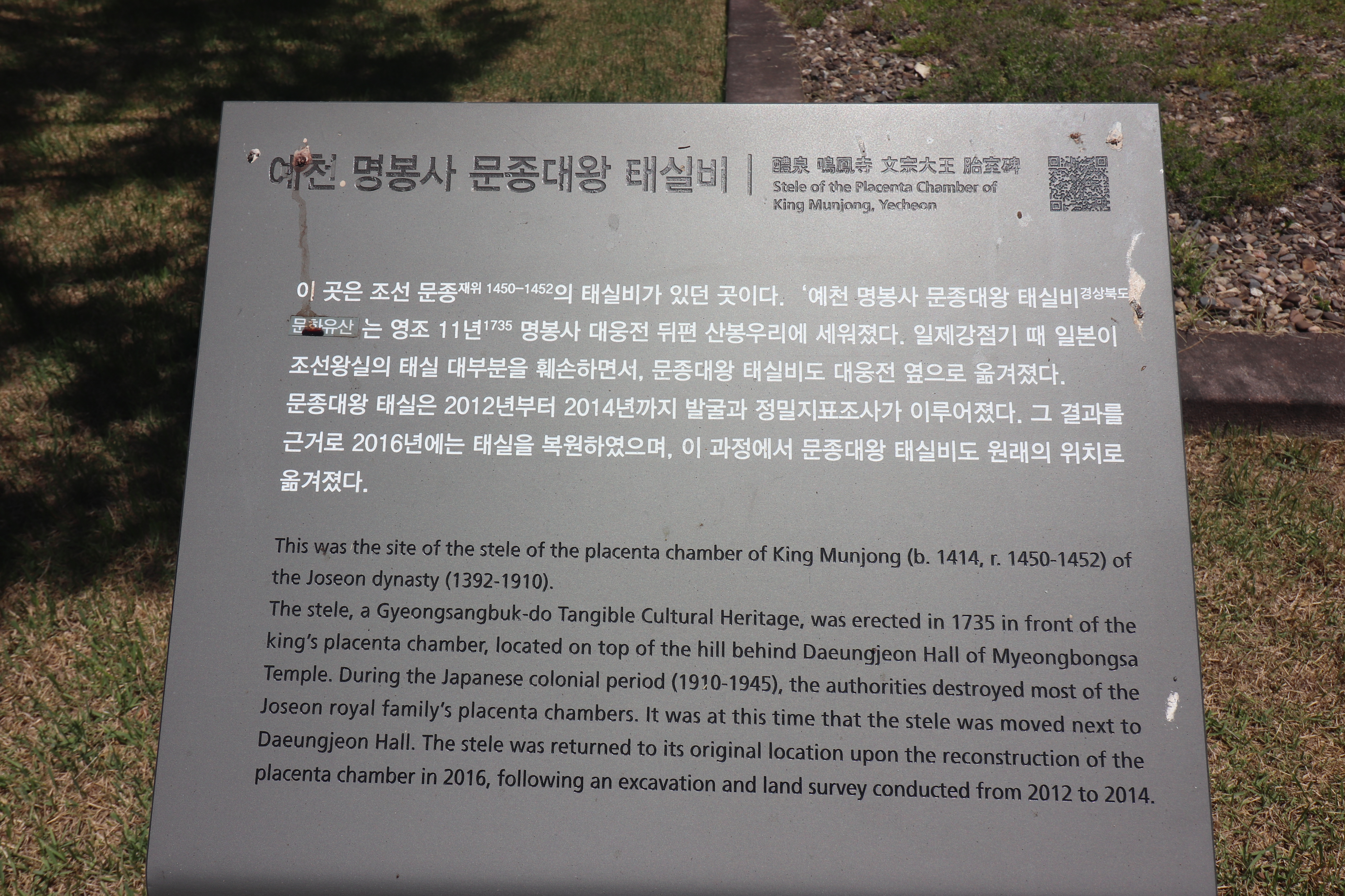 명봉사에서 신기하게 볼 수 있는건 '명봉사 문종대왕 태실비'입니다. 조선 문종의 태를 보관했던 태실을 기념하는 비석인데, 용머리 거북받침돌이 여의주를 물고 있는 모습이 정말 정교한 모습을 갖추고 있습니다. 원래는 절 뒤편 산봉우리에 있었는데 일제강점기에 태실을 발굴한 후 승려들이 경내로 옮겨왔다고 합니다.