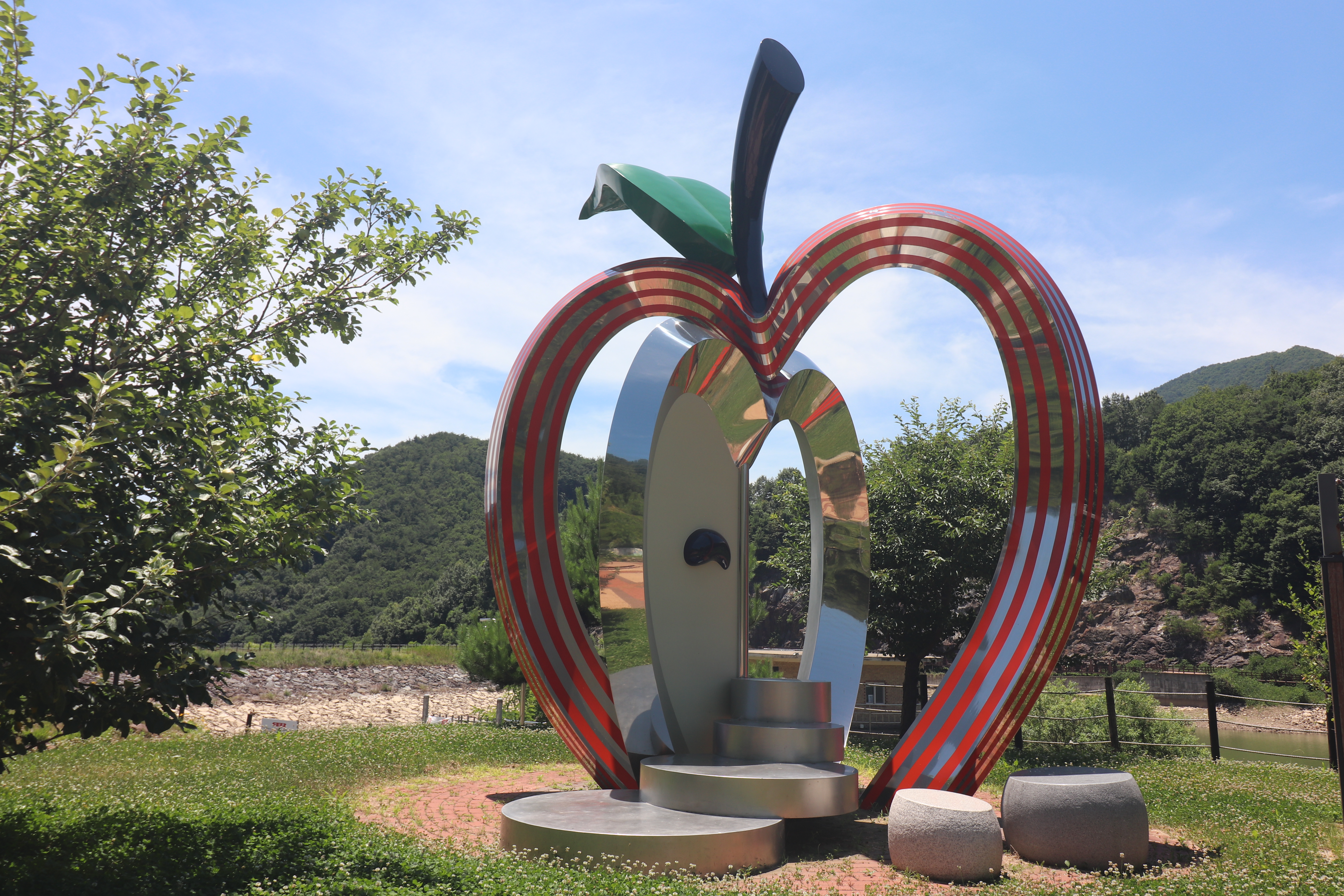 곤충나라 사과테마파크는 무려 12만 평방미터나 되는 어마어마한 규모라고합니다. 백석댐을 중심으로 조성된 이곳은 주변의 아름다운 자연경관을 최대한 보존하면서 만들어졌는데요. 실제로 가보면 인위적으로 조성했다는 느낌보다는 원래부터 있던 자연 속에 재미있는 요소들을 살짝 더한 느낌에 가깝습니다. 사과테마파크라는 이름답게 사과를 테마로 한 주제가 많습니다.