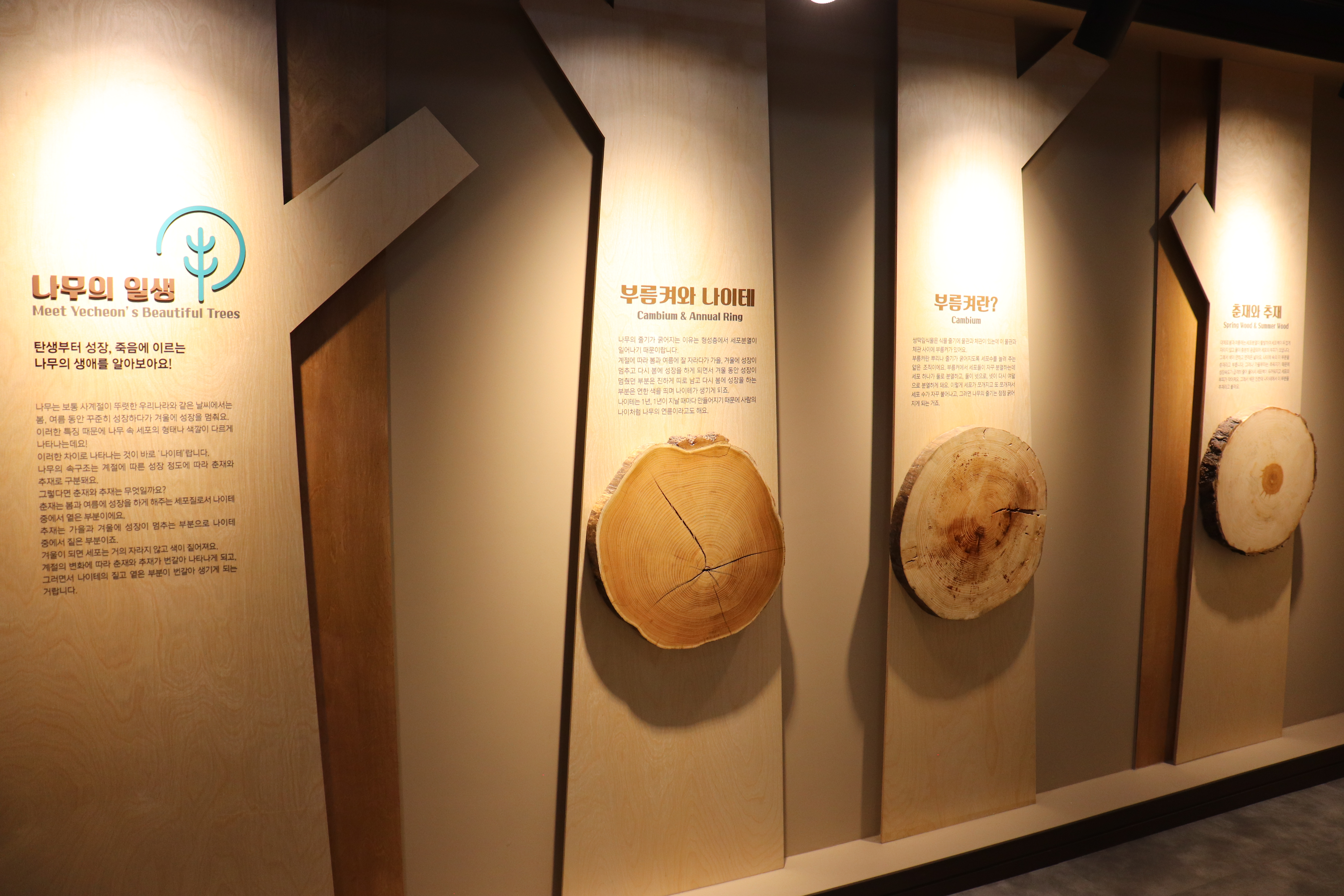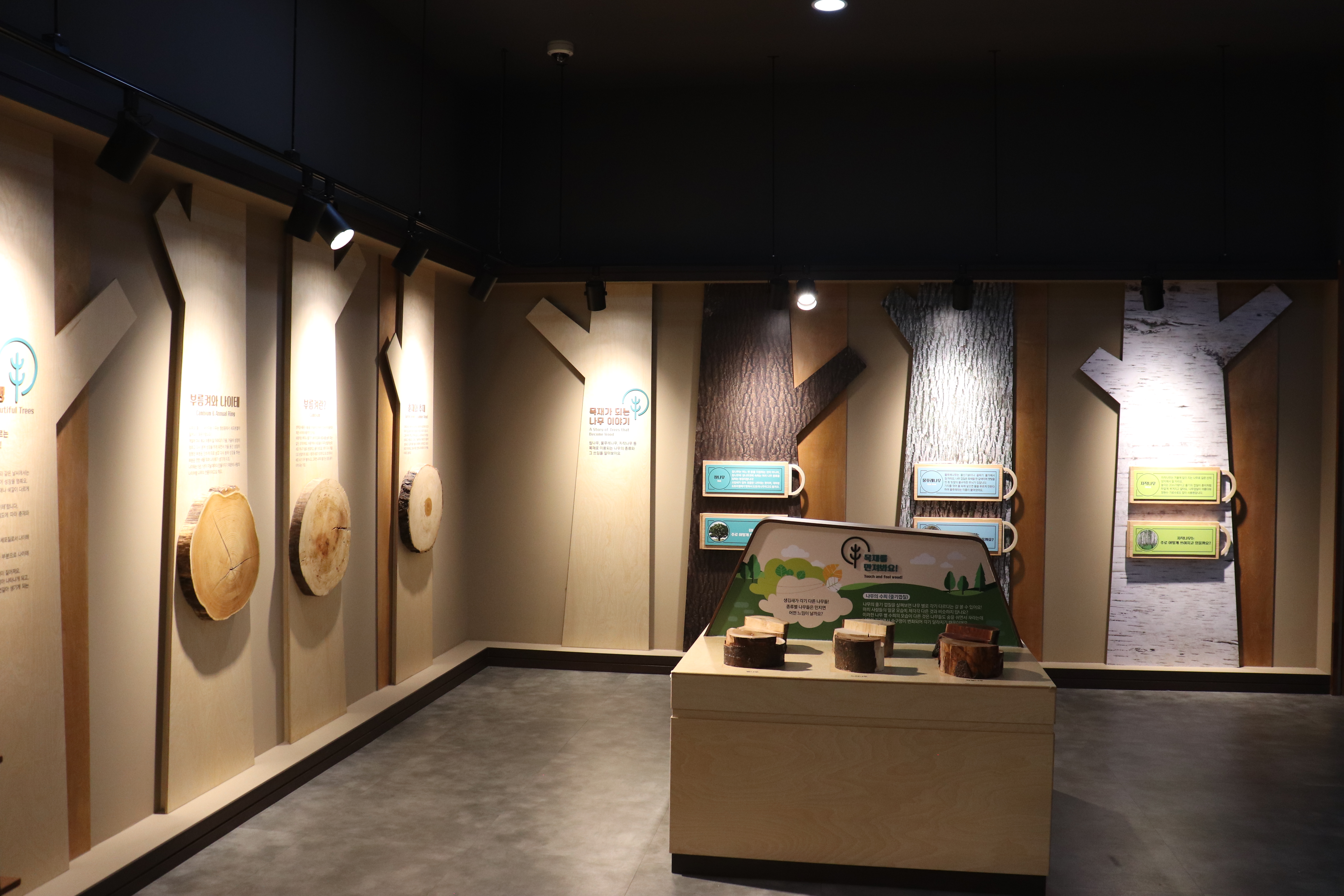 이제 안으로 들어가보면 전시 내용들이 펼쳐집니다. 목재문화 전시실에는 우리나라 고유의 나무들과 목재문화의 역사가 체계적으로 전시되어 있습니다.