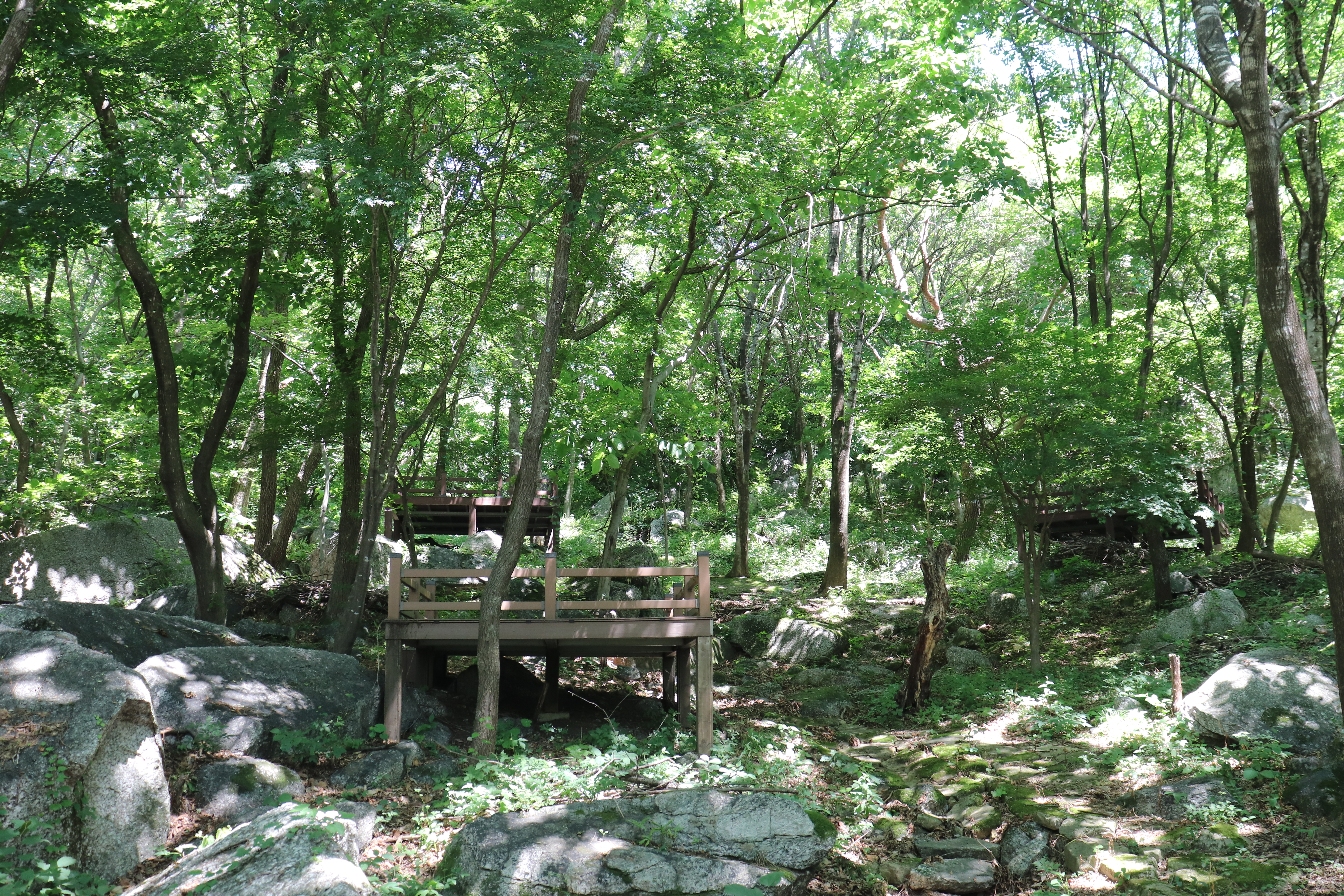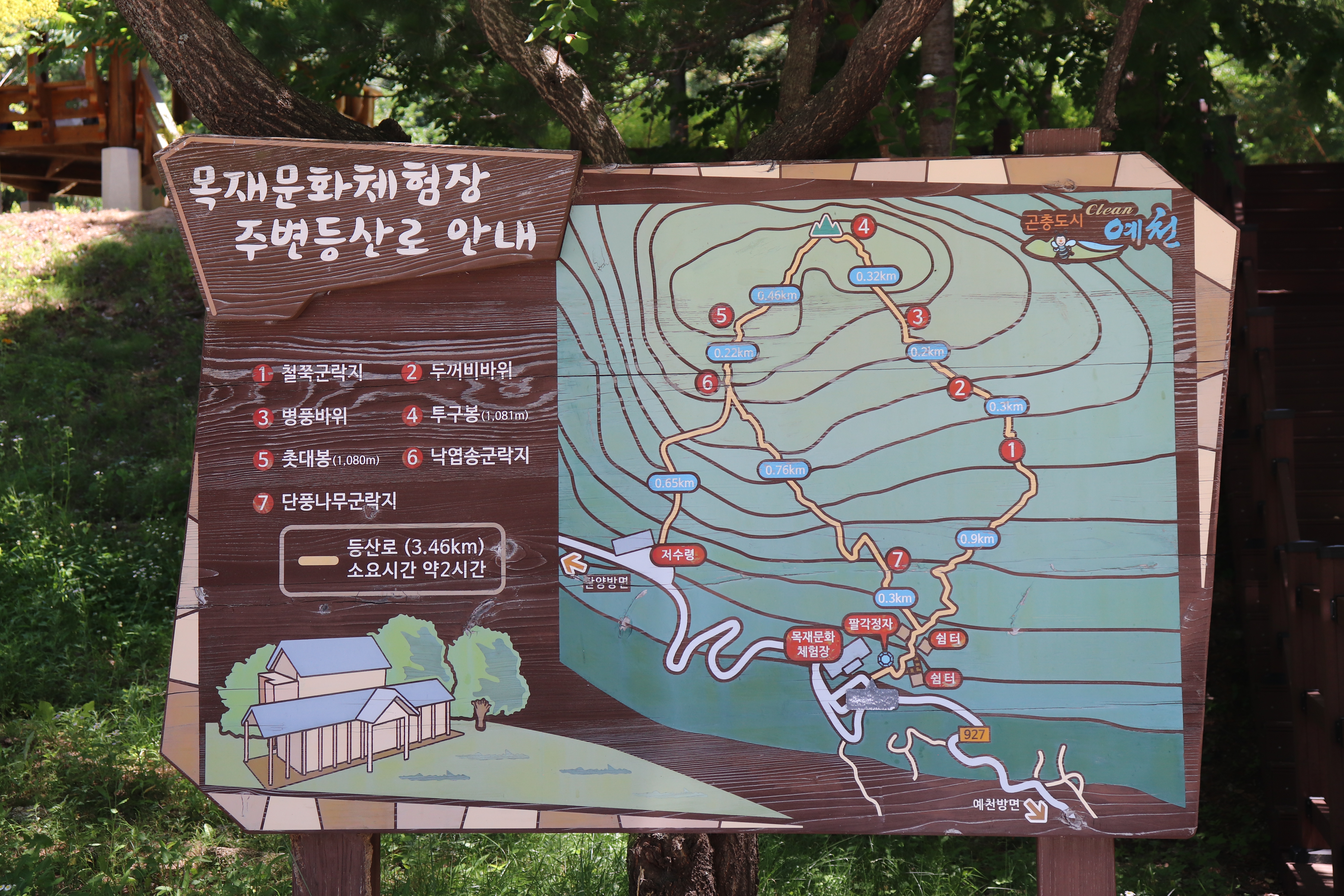 바깥으로 나가서 목재문화체험장 주변등산로도 소개합니다. 철쭉군락지와 두꺼비바위, 병풍바위, 투구봉, 촛대봉, 낙엽송군락지, 단풍나무군락지 등 실제 자연환경을 따라 걸어가는 등산로이며 3키로가 조금 넘기 때문에 전체를 다 둘러보려면 약 2시간이 걸린다고 합니다.
