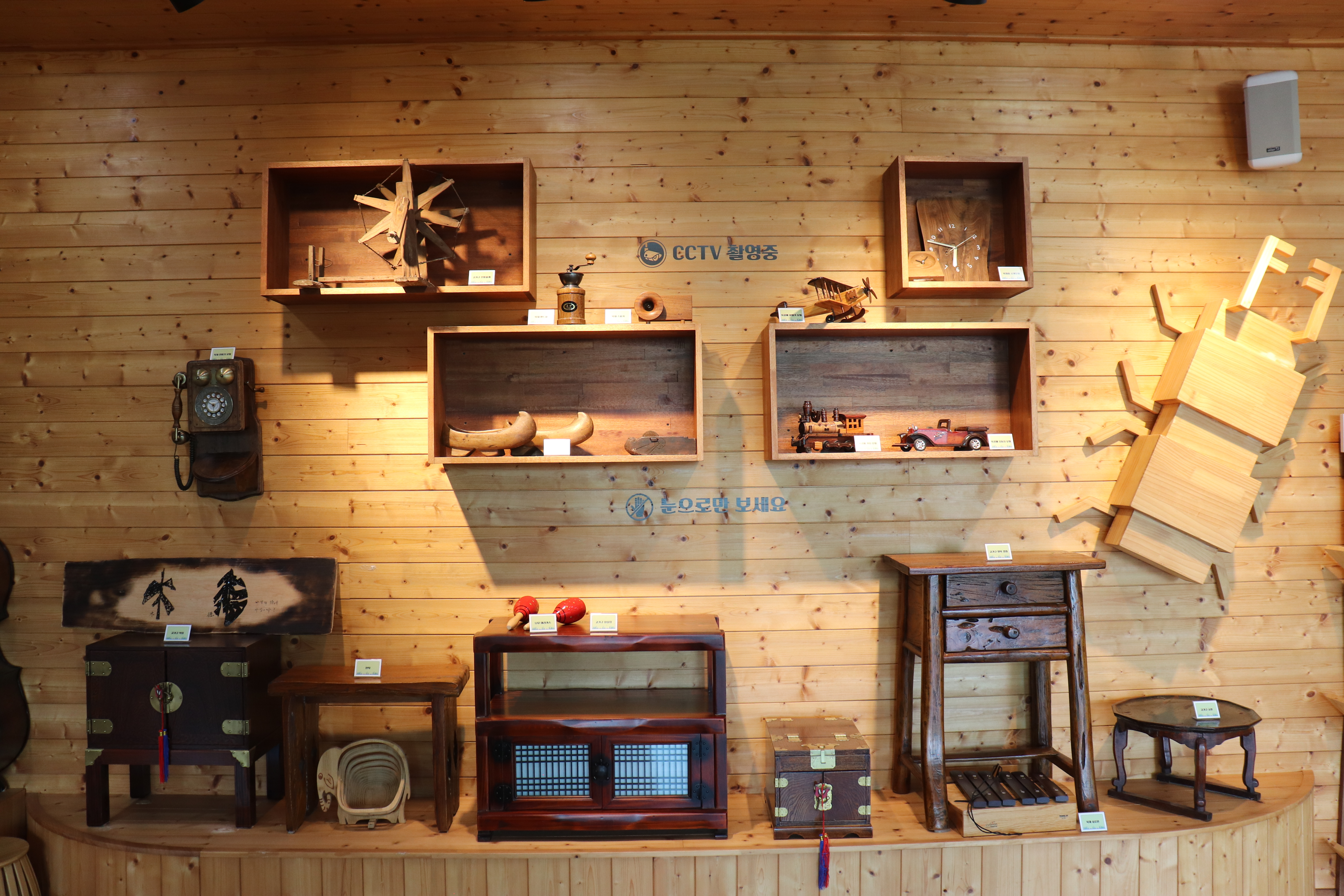 책들도 많고 나무로 만든 생활용품들도 볼 수 있습니다.