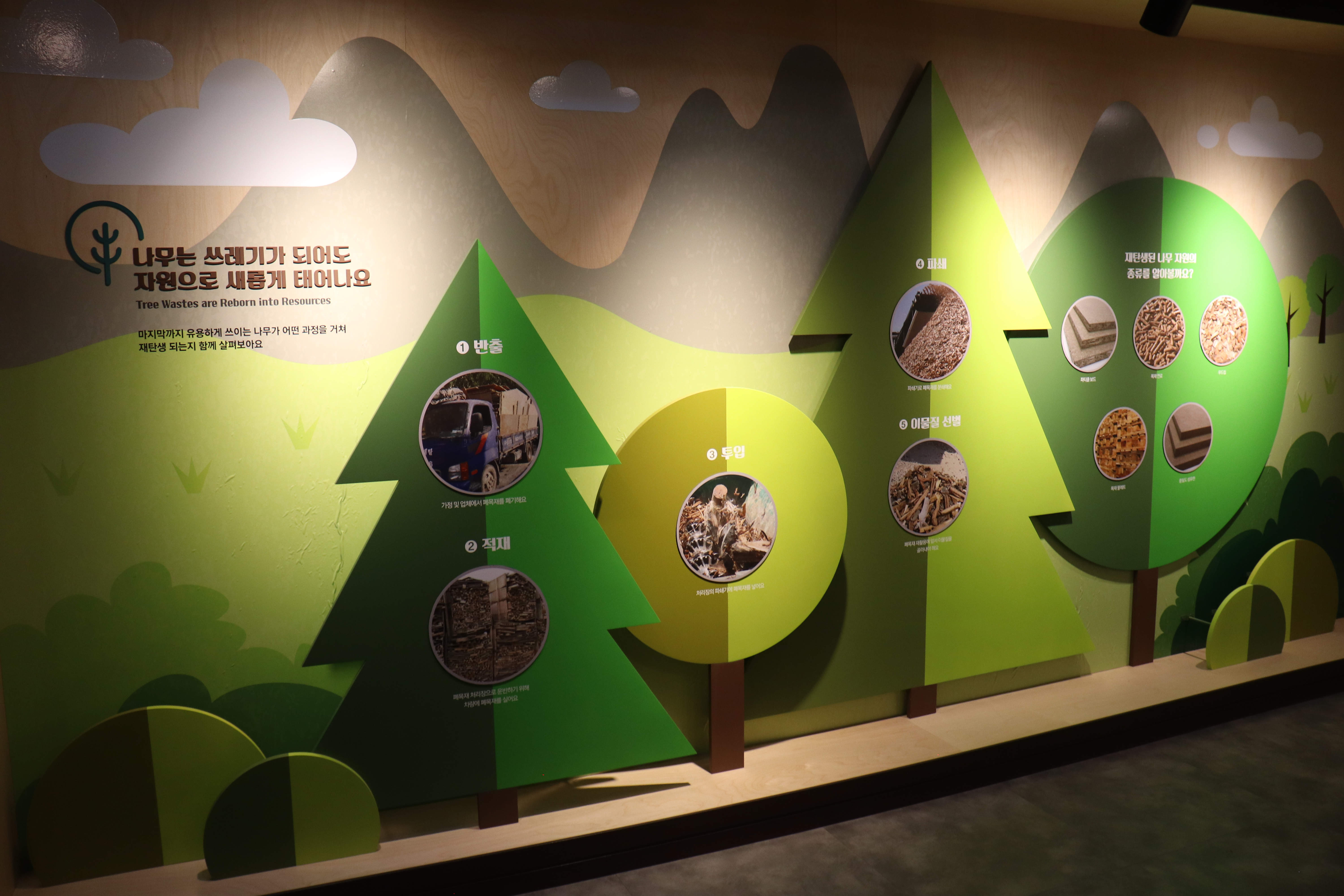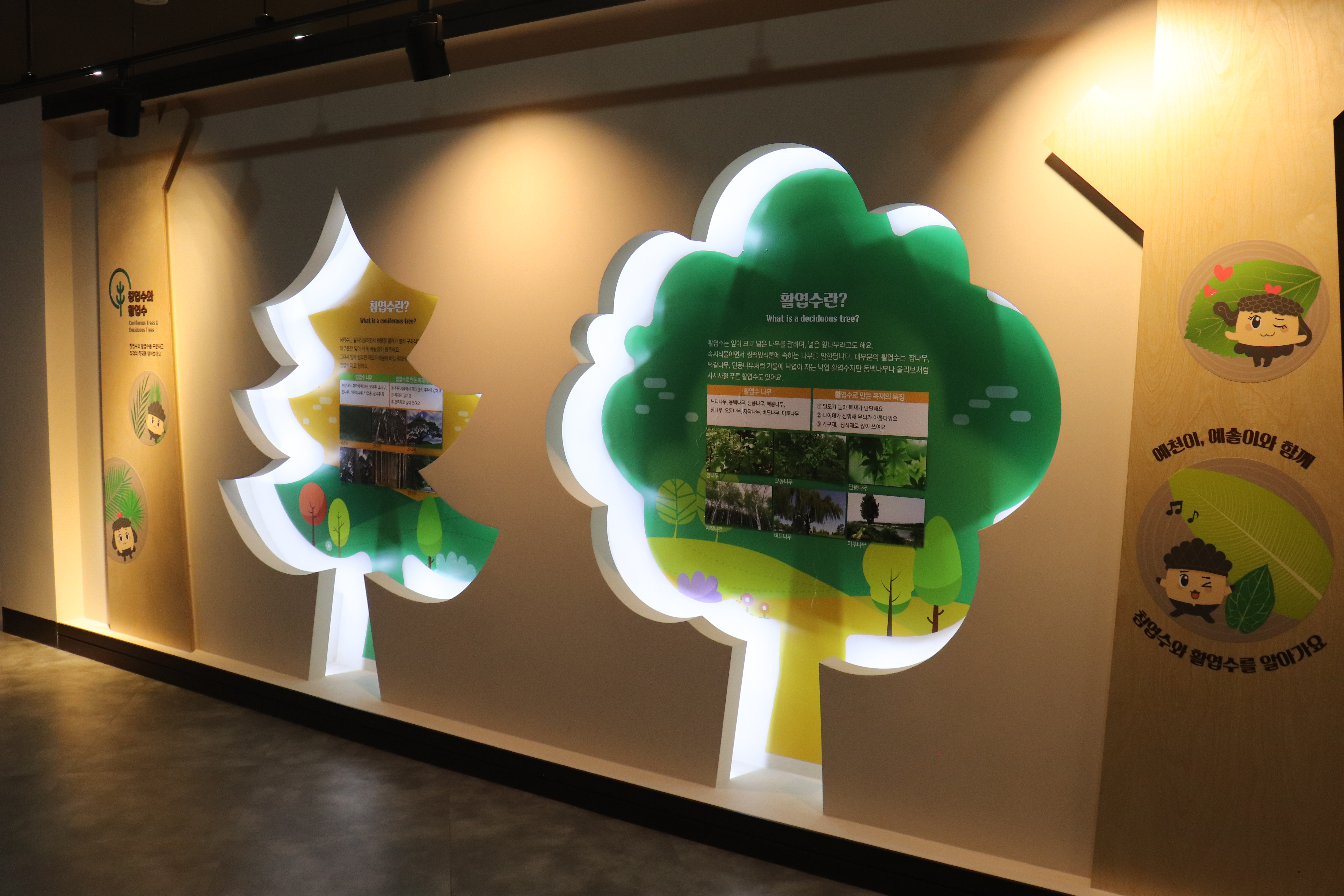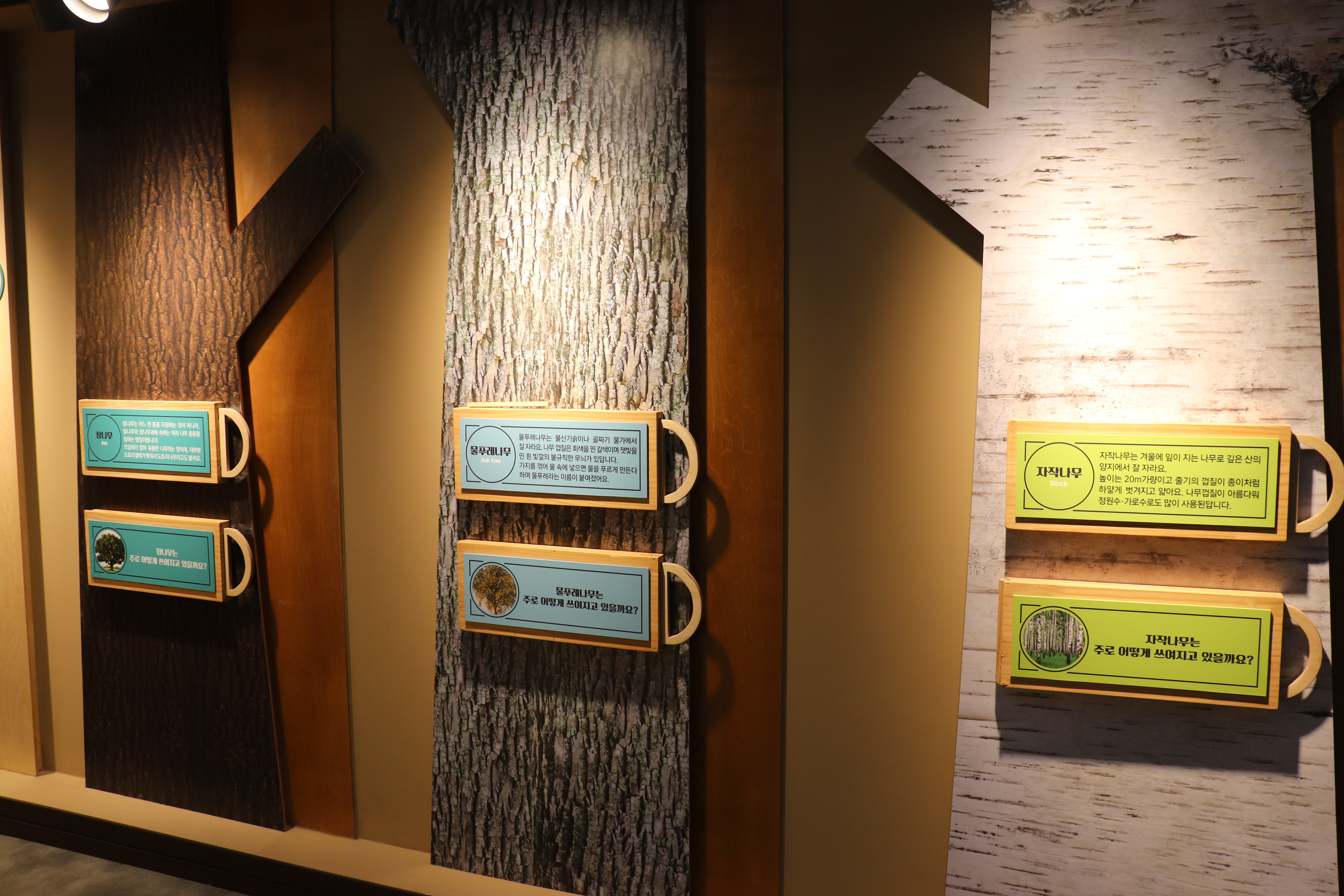 이제 안으로 들어가보면 전시 내용들이 펼쳐집니다. 목재문화 전시실에는 우리나라 고유의 나무들과 목재문화의 역사가 체계적으로 전시되어 있습니다.