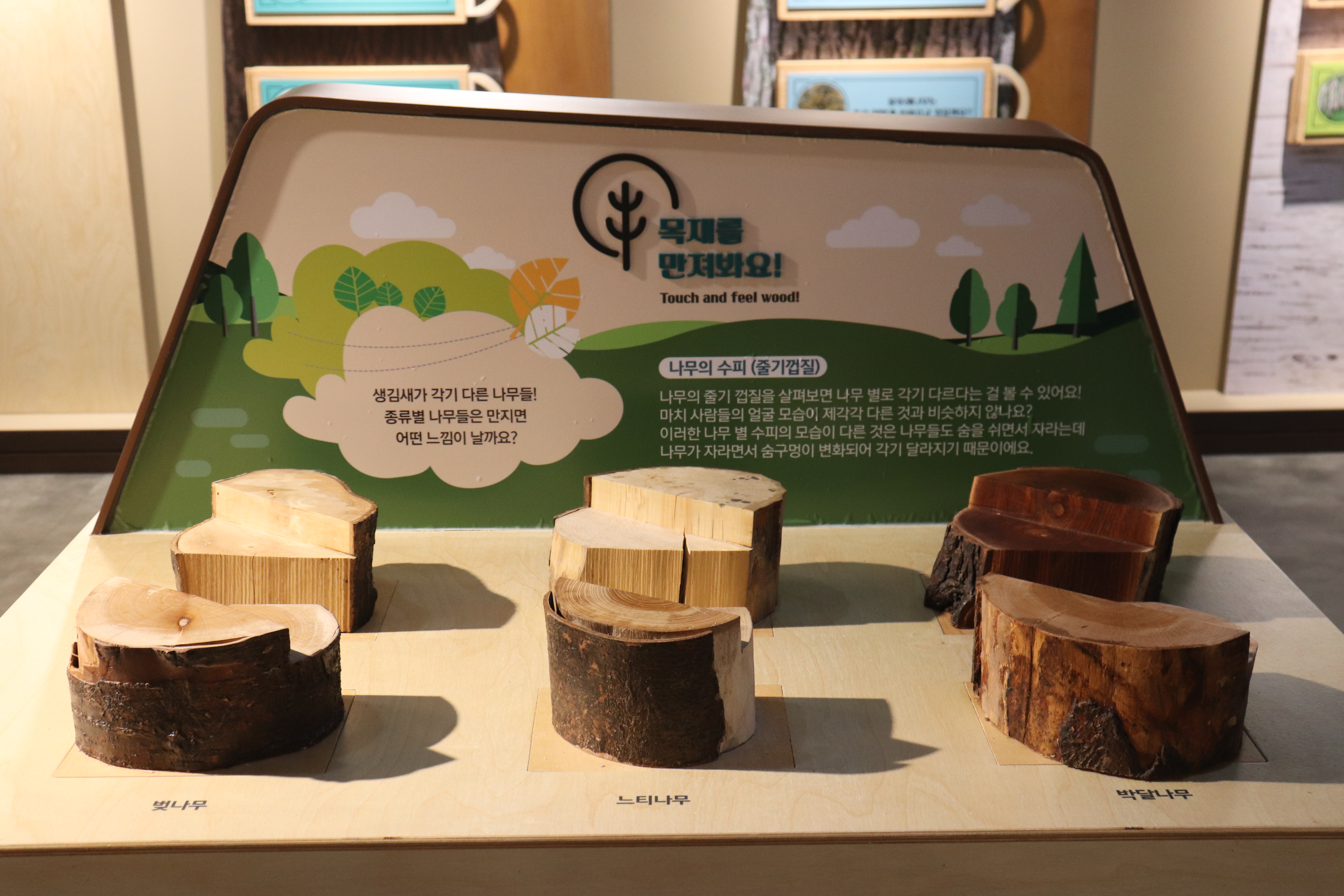 소나무, 참나무, 느티나무, 전나무 등 우리 주변에서 흔히 볼 수 있는 나무들이지만, 각각의 특성과 쓰임새를 자세히 알게 되니까 정말 흥미로웠습니다. 목재를 직접 만져보고 차이를 느낄 수 있는 코너도 마음에 들었습니다. 같은 나무라도 부위에 따라 질감이 다르고, 나무마다 고유한 향이 있다는 걸 알 수 있는 공간이에요.