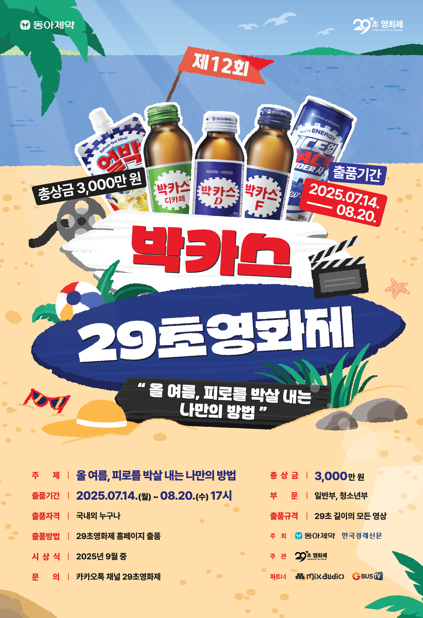 영상 제작에 관심 있는 분들은 물론이고, 평소에 창의적인 아이디어가 많으신 분들, 박카스 마니아 분들, 여름철 피로 회복에 관심 있으신 분들...등 누구든 도전해볼 수 있는 29초영화제인데요. 이번 29초영화제 주제가 "올 여름, 피로를 박살 내는 나만의 방법"이라서 다양하고 재미있는 영화제 작품들이 많이 나올 것 같습니다.