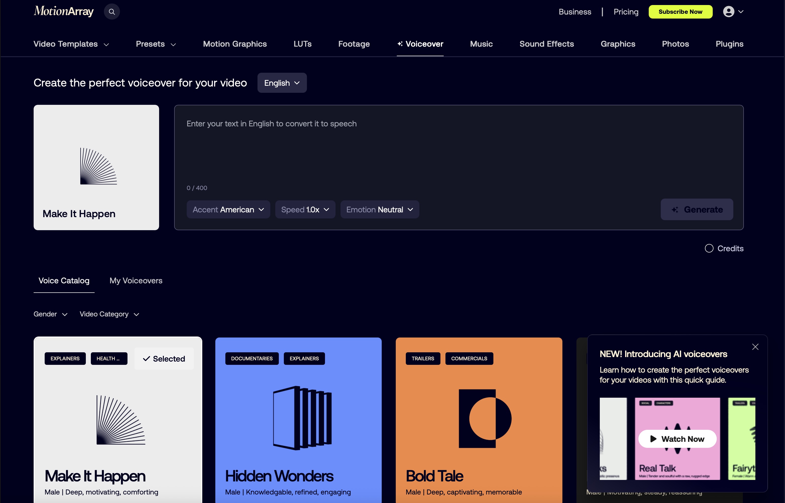 "제 목소리가 너무 어색해서 나레이션을 못하겠어요..." 이제 그런 고민은 끝! 모션어레이의 AI 보이스오버 기능으로 전문 성우 수준의 나레이션을 만들어보세요. 비교적 최근에 추가된 기능으로서 매우 활용도가 높은 기능이며 퀄리티가 엄청 좋습니다!