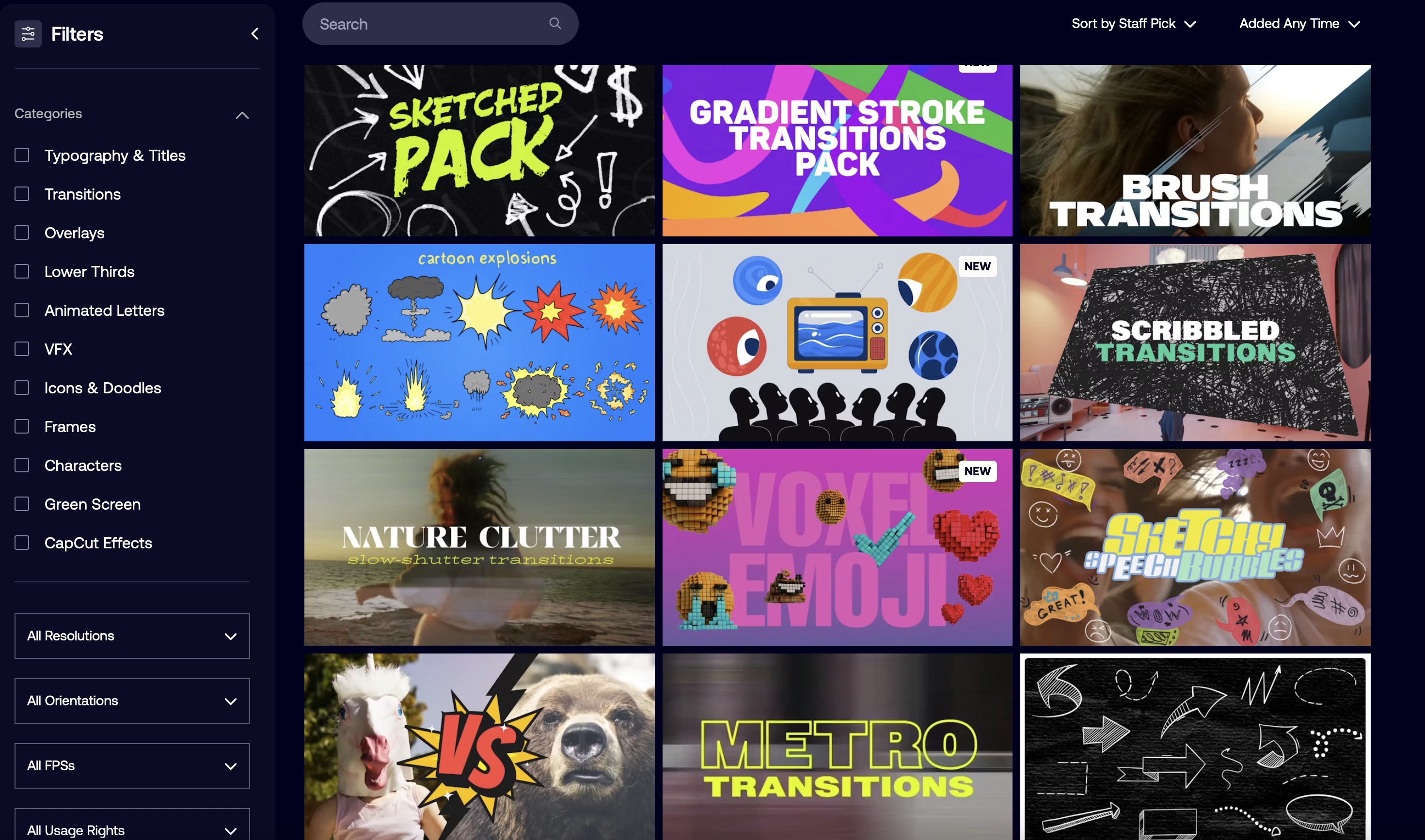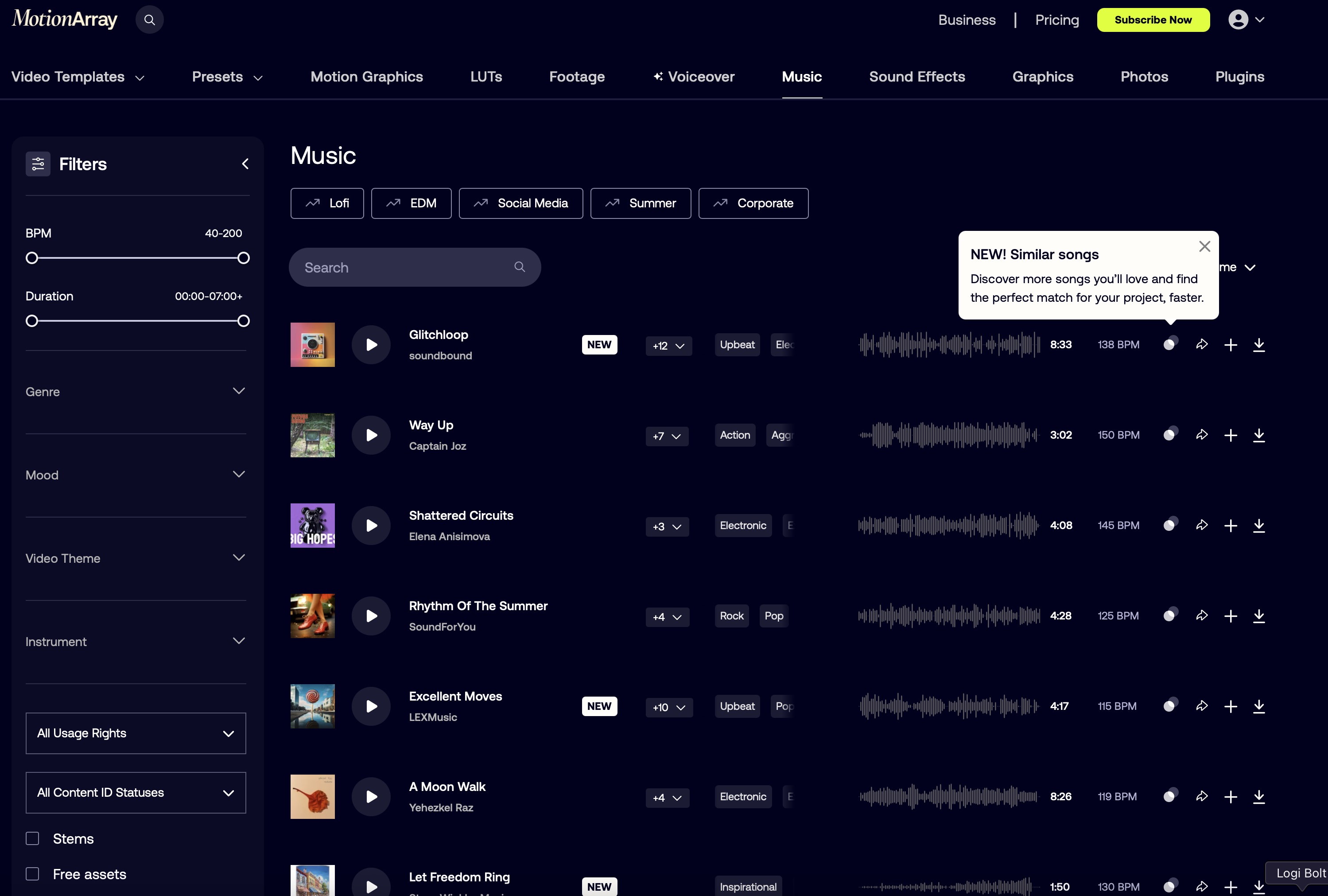 최근 업데이트된 기능입니다. 깔끔한 새 레이아웃으로 원하는 자산을 더 빠르게 찾을 수 있고, 비슷한 트랙이나 음향효과도 쉽게 발견할 수 있습니다.