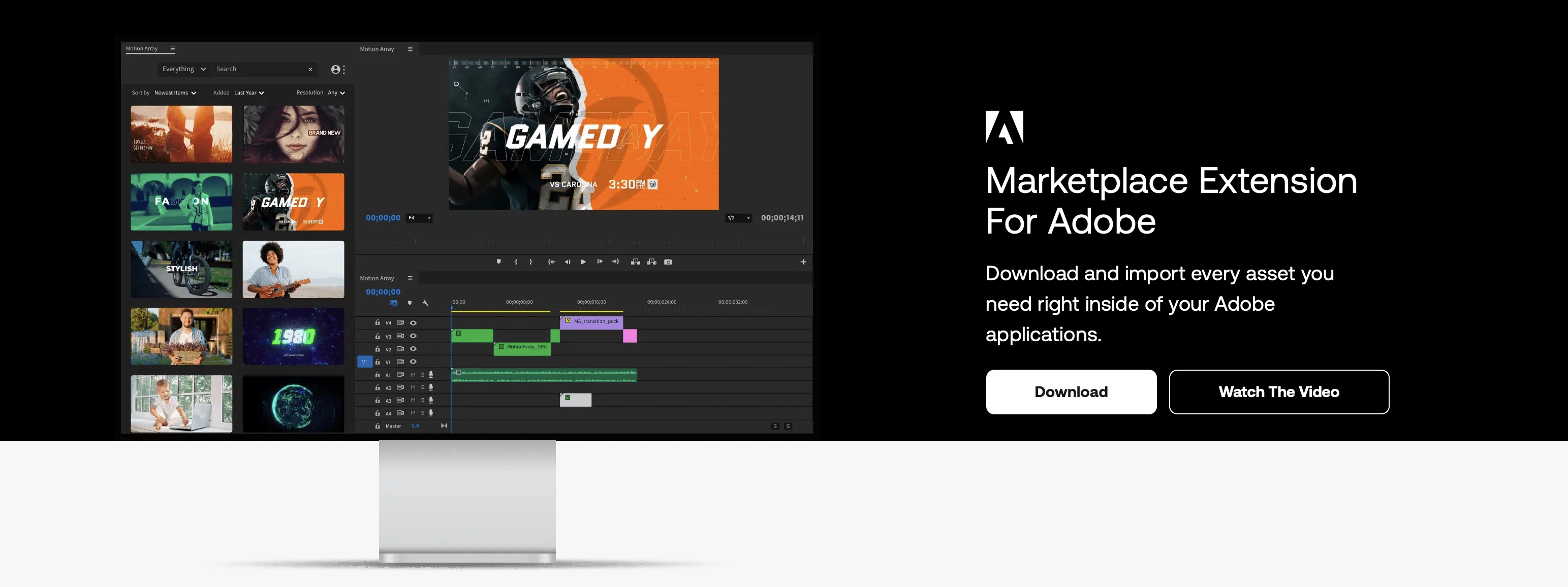 "편집하다가 자산 찾으러 웹사이트 갔다 오는 게 번거로워요..." 이제 그런 고민은 끝! Motion Array Library Extension을 설치하면 프리미어프로 안에서 바로 모든 작업이 가능해집니다.