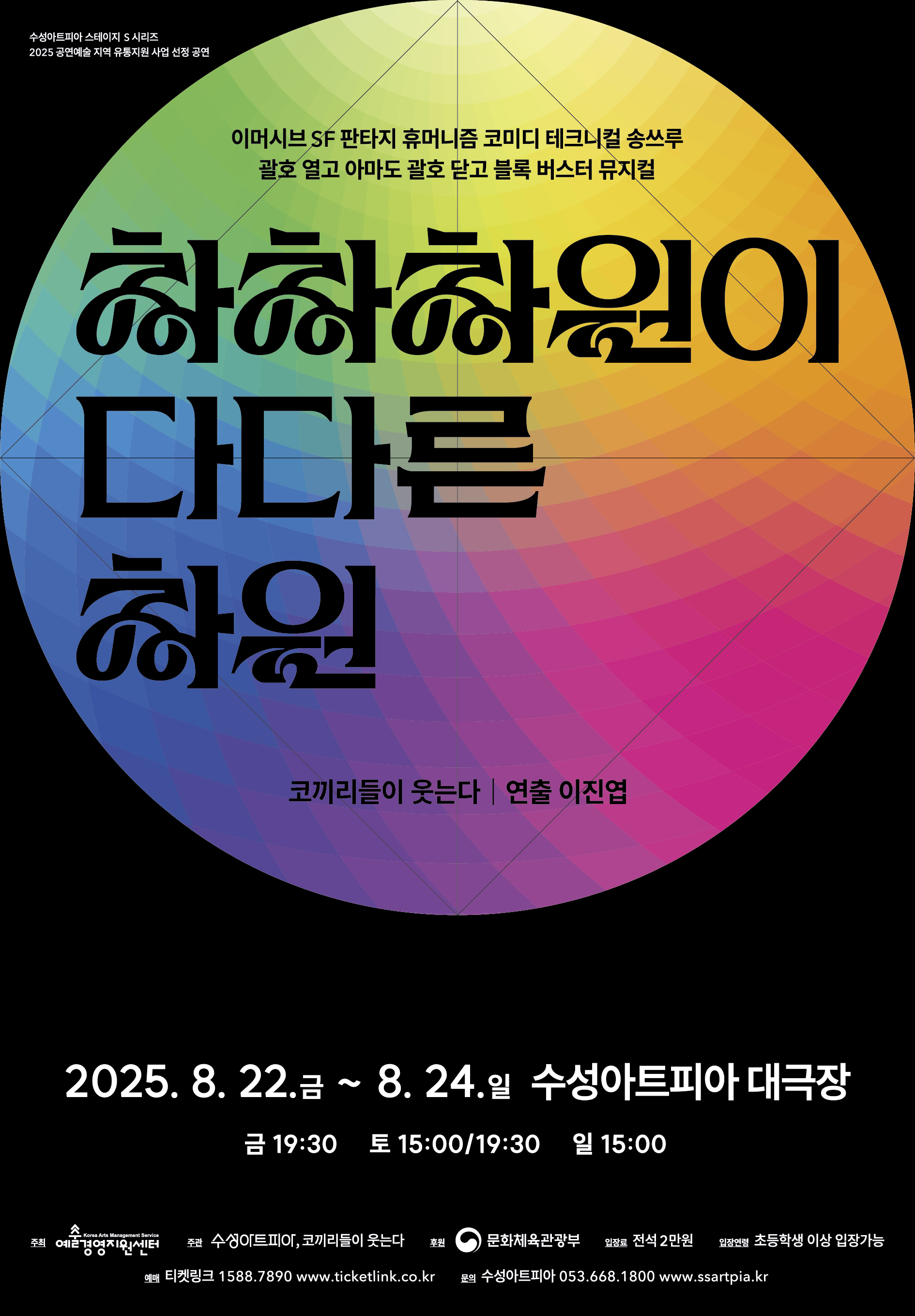 혹시 공연 보면서 "아, 나도 저기서 같이 노래하고 싶다!", "저 춤 나도 출 수 있는데!" 하고 생각해본 적 있으실거에요. 그런 분들을 위한 정말 특별한 공연이 수성아트피아에서 열립니다. 바로 <차차차원이 다다른 차원>이라는 이머시브 뮤지컬인데요. 제목부터 뭔가 독특한 것 같습니다. 그런데 더 독특한 건 이 공연의 컨셉이에요. "객석과 무대 구분 없이 관객과 배우가 만들어나가는 이머시브형 송스루 공연"이라고 합니다. 그냥 앉아서 보는 게 아니라 관객들이 직접 참여해서 함께 춤추고 노래하면서 공연을 만들어가는 방식입니다!