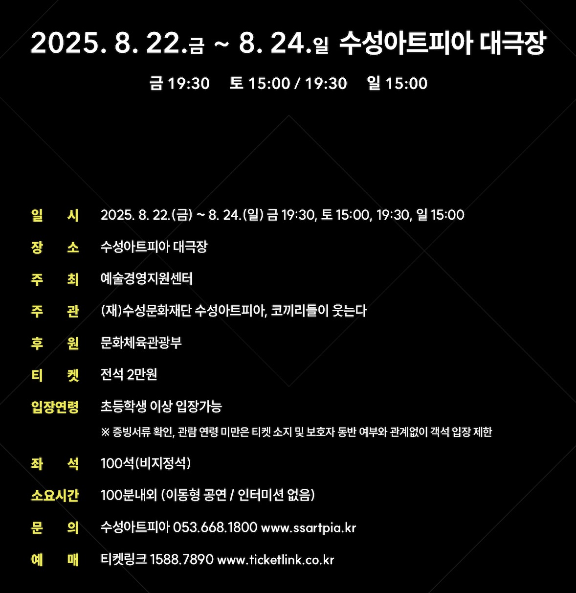 예매는 티켓링크(1588-7890)나 수성아트피아(053-668-1800)로 할 수 있다고 하니까 미리미리 예약해두시는 게 좋습니다.