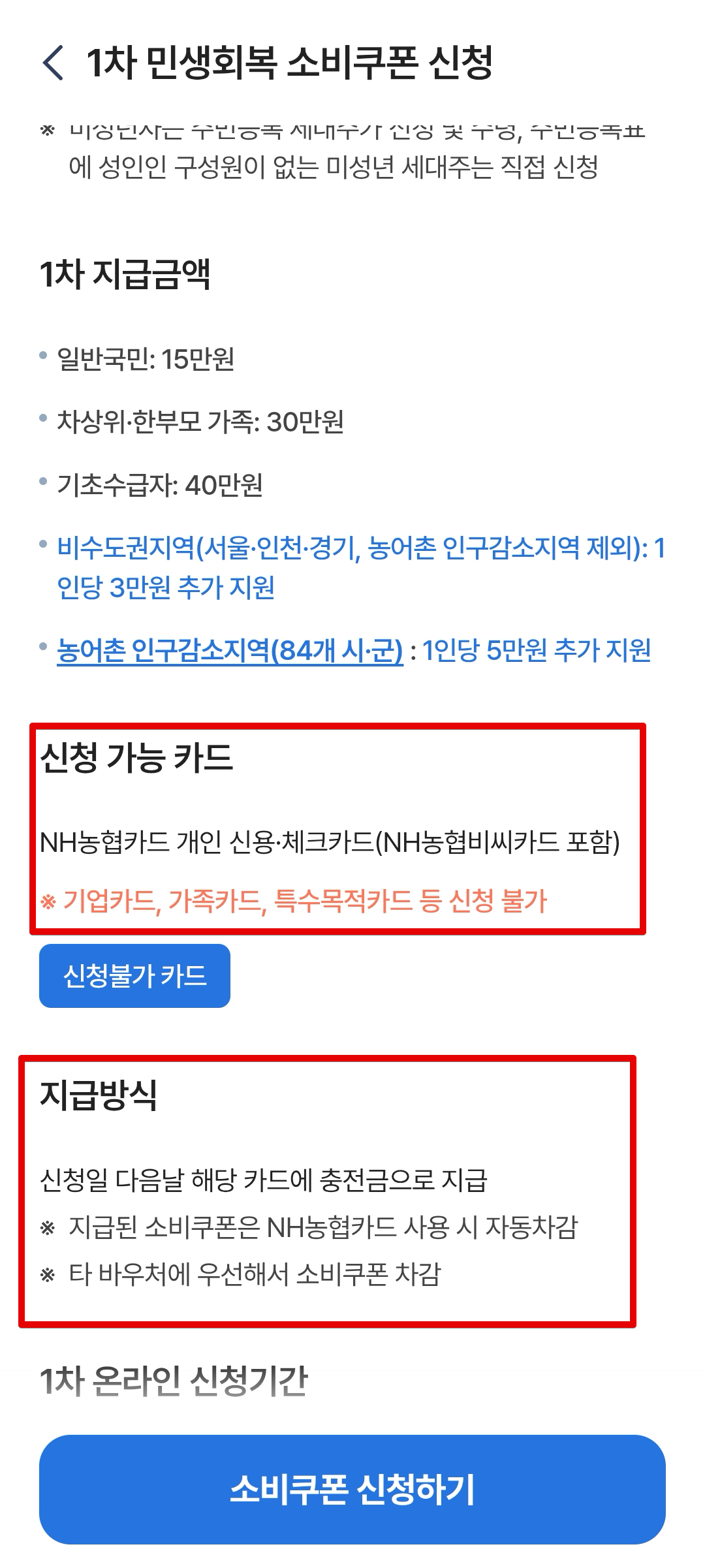 지급방식을 주의해야한다. 일단 신청을 하고, 신청한 다음날 해당 카드에 충전금으로 지급되는 방식이다. 따라서 오늘 신청하면 내일 충전금이 충전되며 이때부터 충전금인 소비쿠폰을 쓸 수 있다. 내일 충전되는건 알겠는데 몇 시에 충전되는지는 모르겠다.