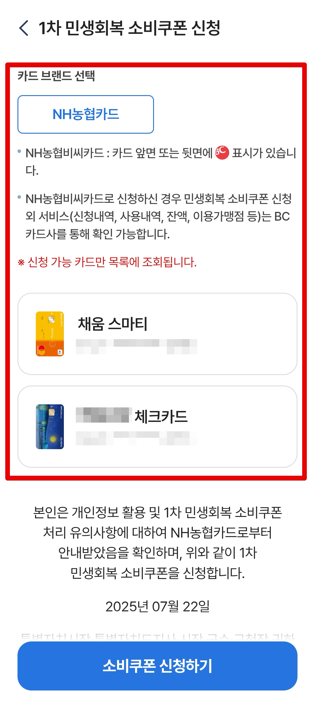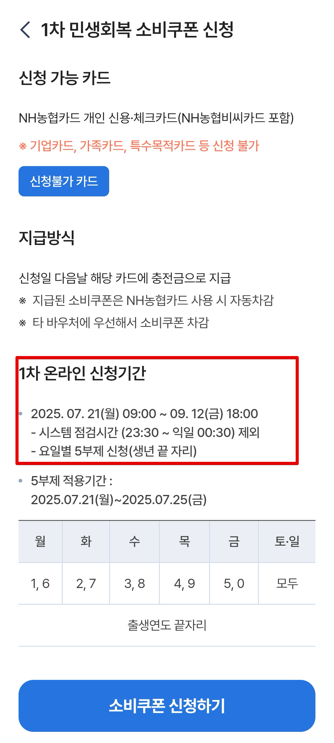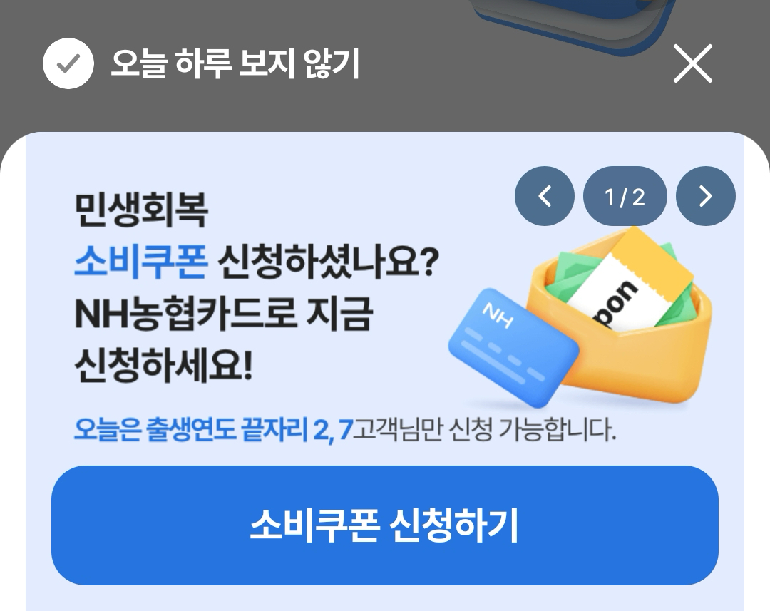 NH농협은행을 통해서 민생회복 소비쿠폰을 신청하였다. 신청 첫주인 이번주는 5부제로 진행되기 때문에 출생연도 끝자리를 기준으로 날짜에 맞는 날로 신청해야하며 나머지는 신청이 안된다. 자주 쓰는 메인 카드가 NH농협은행 카드이므로 NH농협은행 카드로 신청하였다.