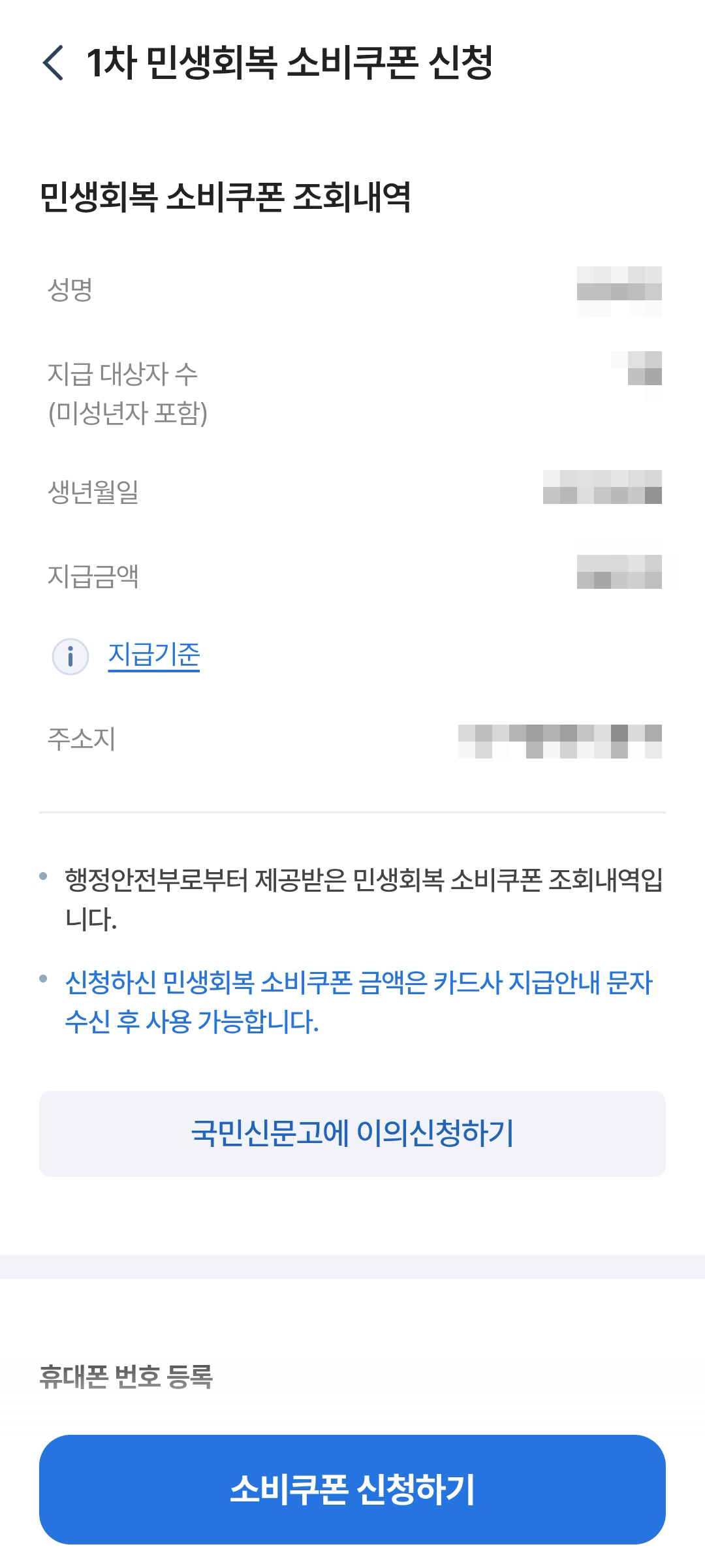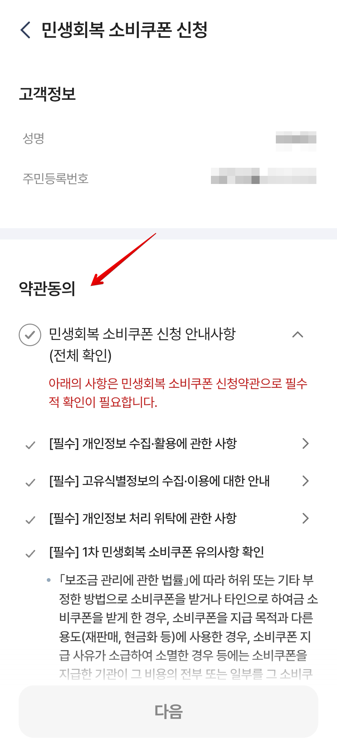 소비쿠폰 사용지역도 유의해야한다. 광역으로만 쓸 수 있다. 도 이하 시군이라면 해당 시군에서만 쓸 수 있다. 예를들어 대구면 구 관계없이 대구시 전체에서 쓸 수 있는데 안동은 안동시에서만 쓸 수 있다. 약관 동의 후 넘어가면 된다.