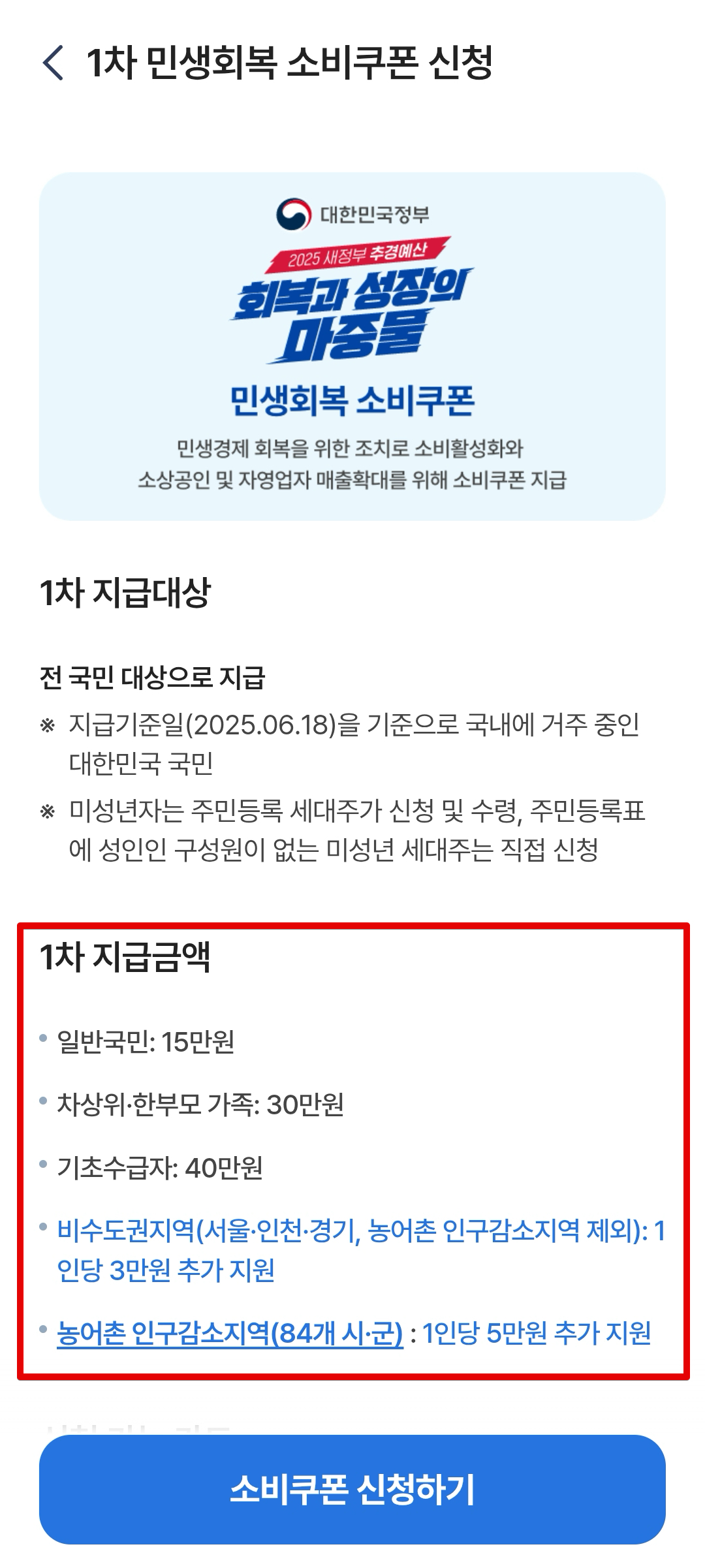 접속해서 들어가면 [1차 민생회복 소비쿠폰 신청] 버튼이 보이고 이쪽을 클릭하면 된다. 1차 지급금액은 거주지역에 따라 금액이 달라지는데 일반국민은 15만원이지만, 비수도권은 3만원 추가, 농어촌 인구감소지역은 5만원이 추가되어서 18만원~20만원이 지급금액이 된다.
