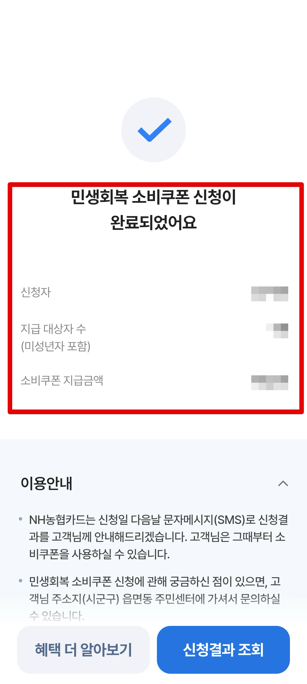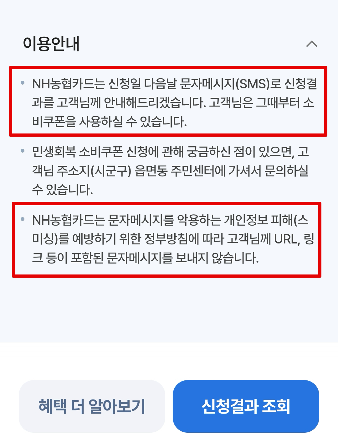 NH농협카드에서는 신청일 다음날 문자메시지인 SMS로 신청결과를 안내해준다고 한다. 이 안내 문자를 받은 뒤에만 소비쿠폰을 쓸 수 있다. 그전에는 그냥 일반 결제가 되니 유의하자. 이번에 보이스피싱도 많이 늘어나고 스미싱 같은것도 많기 때문에 소비쿠폰 관련 링크가 있으면 피싱 문자이며 클릭하면 안된다.