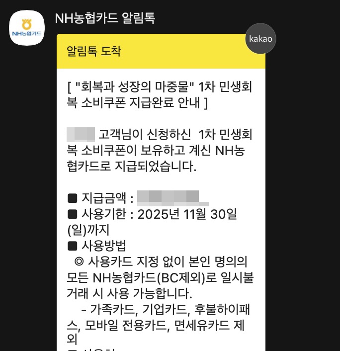 하루 뒤인 오늘, 오전 8시 30분경 NH농협으로부터 카톡 알림톡으로 지급완료 안내를 받았다. 이 안내 문자를 받은 뒤부터 본격적으로 사용하면 되는 방식이다.