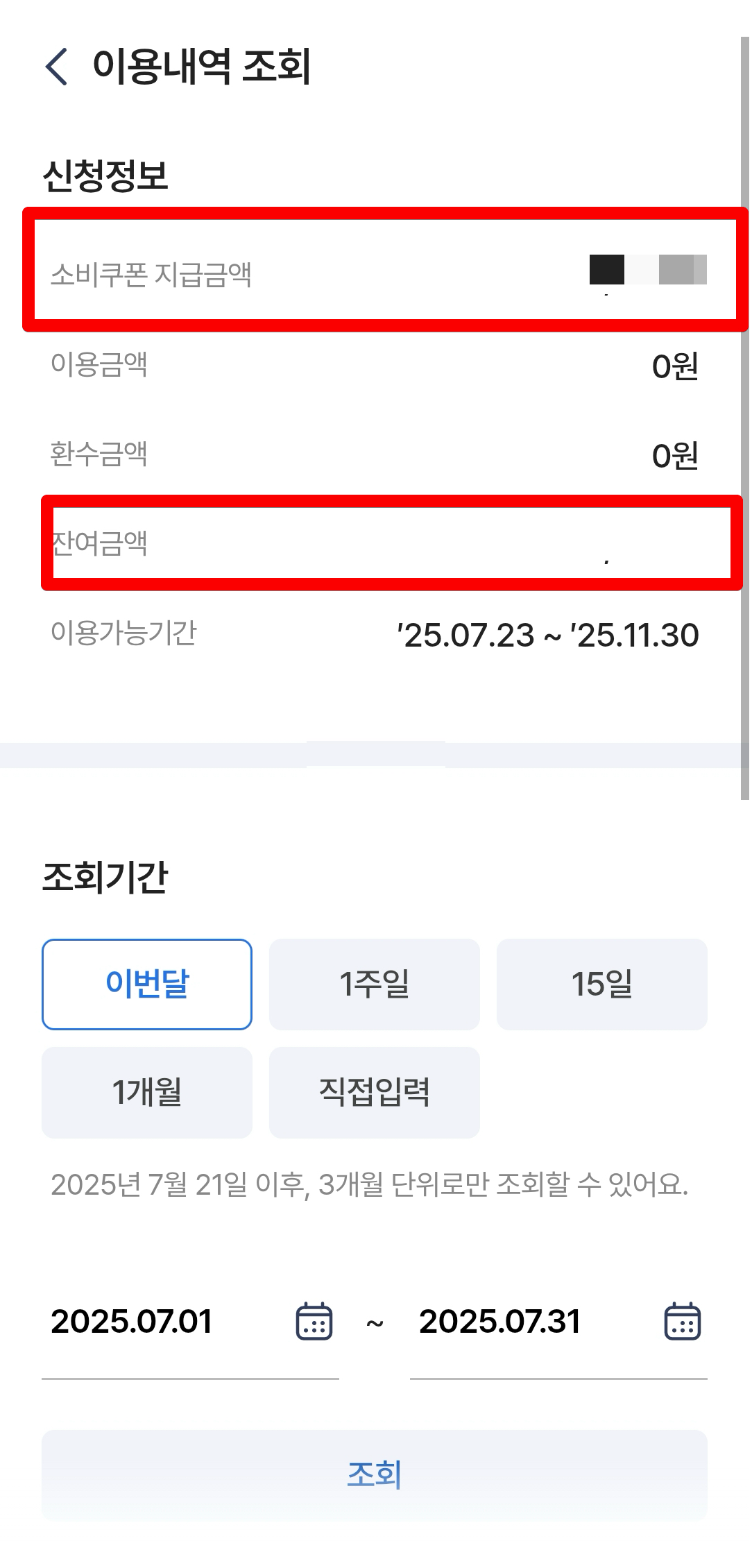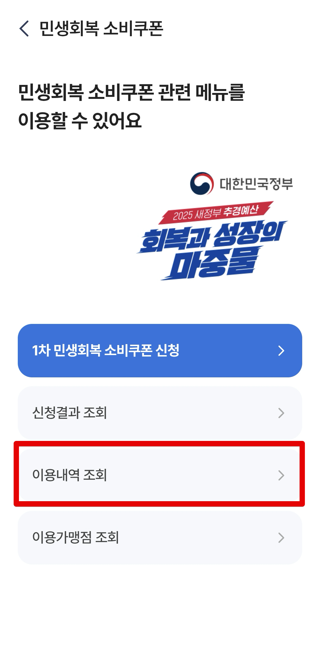 여기에서 제일 위에 보면 [공공사업] 카테고리에 [민생회복 소비쿠폰] 메뉴가 있다. 여기를 클릭해서 들어간 후 [이용내역 조회]를 통해 잔액을 확인할 수 있다. 알맞게 1원 한푼 남기지 않고 다 쓸려면 조금 계획적인 소비가 필요해보인다. 자투리 돈 남으면 골치아파질 수 있으므로 나는 천원 단위 또는 만원 단위 결제에서만 쓸려고 생각 중이다. 나머지는 소비쿠폰 다 쓸 때까지는 다른 카드로 결제 예정.