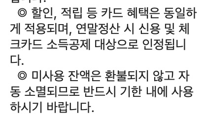 카드에 연결하는 형태로 발급받은 케이스다. 이렇게하면 할인 또는 적립 등 카드 혜택을 동일하게 받을 수 있을 뿐만 아니라 연말정산 시 시용 및 체츠카드 소득공제 대상으로 인정까지 받을 수 있어서 유리하다. 미사용 잔액의 경우 소멸되기 때문에 1원 한푼 남기지 않고 다 쓰는게 중요하다.