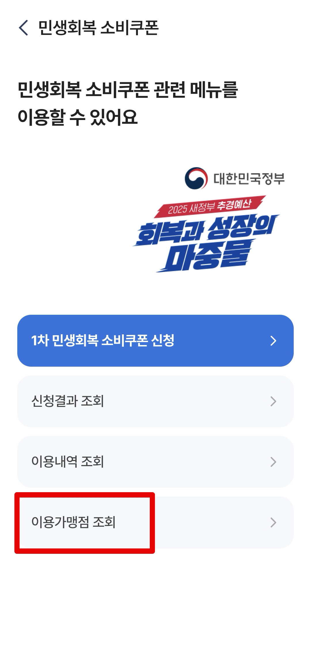 해당 메뉴에서 [이용가맹점 조회] 메뉴로 들어간다. 이후 지역과 구를 선택하고 업종을 선택하면 아래쪽에 이용 가능 가맹점이 조회된다. 자신이 갈 곳이 가맹점인지 체크한 후 가는게 좋다.