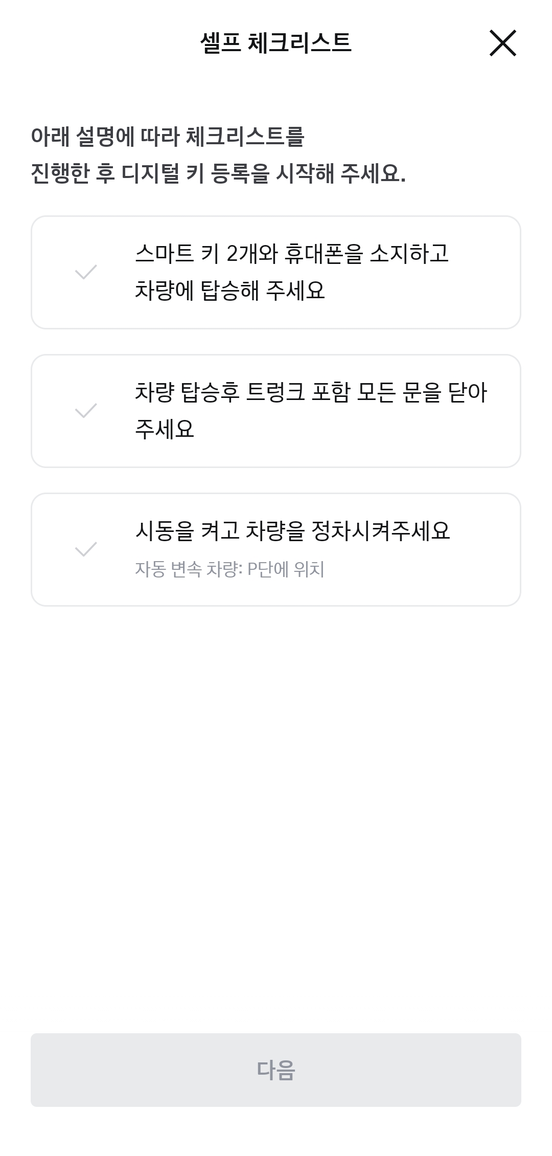 폰이 바뀌면서 기존에 사용하던 디지털 키와 폰이 달라졌다. 디지털 키는 한 대의 기기에서만 사용이 가능하다고 한다. 그래서 초기화를 먼저 해준다. 다음으로 디지털 키 등록을 진행해준다. 셀프 체크리스트가 나오는데 여기에 보면 스마트 키 2개를 모두 소지하고 차로 가야한다고 명시돼 있다. 1개만 있을 경우 오류가 난다는 후기가 있었다.