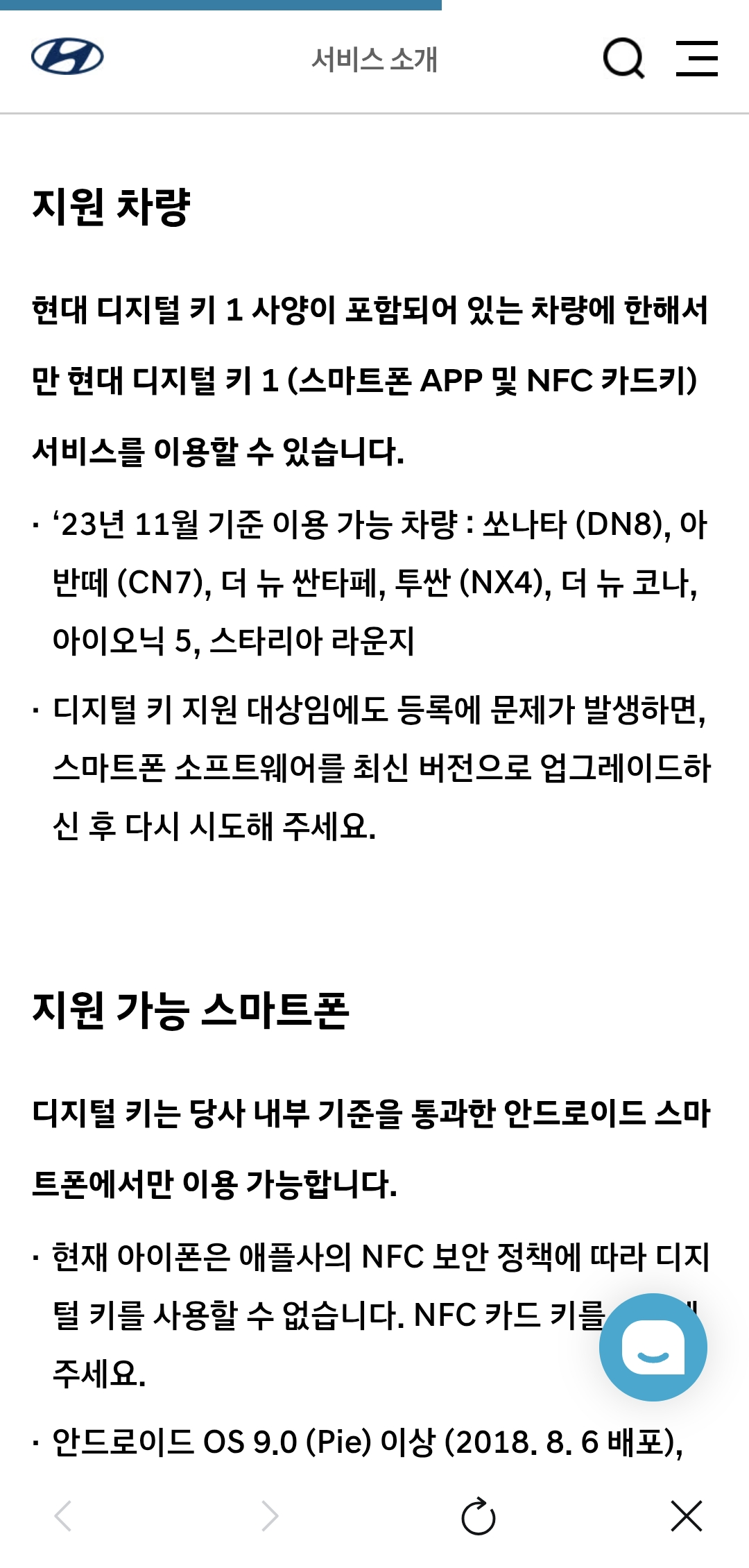마이현대 앱 디지털키와 NFC카드 키 등을 간단하게 안내해주고 지원 차량 목록과 지원 가능 스마트폰도 볼 수 있다. 아이폰은 NFC 정책 때문에 이거 못쓴다... 그래서 예전에 이거 때문에라도 아이폰에서 갤럭시로 바꿨던 기억이 있다. 근데 지금은 아이폰보다 갤럭시가 더 좋다 ㅎㅎ