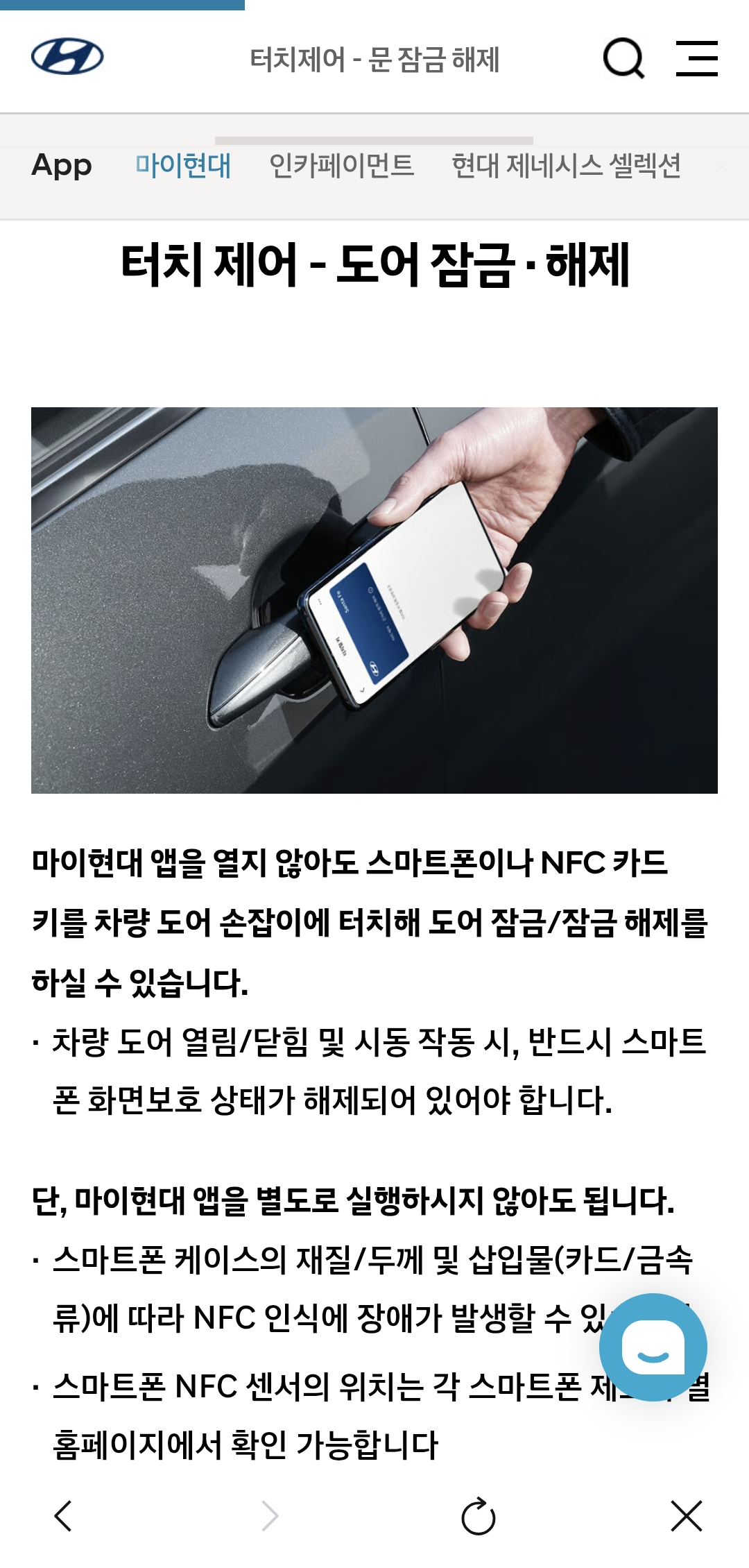 스마트폰으로 디지털키를 등록해놓으면 이렇게 폰을 마치 카드키처럼 인식시키는 방법으로 차 문을 열 수 있고 차에 시동도 걸 수 있다. 차 문 닫는것도 가능해서 깜빡하고 차 키 안들고 가거나 주머니 없을 때 이용하는 편이다. 굉장히 유용한 기능이다.