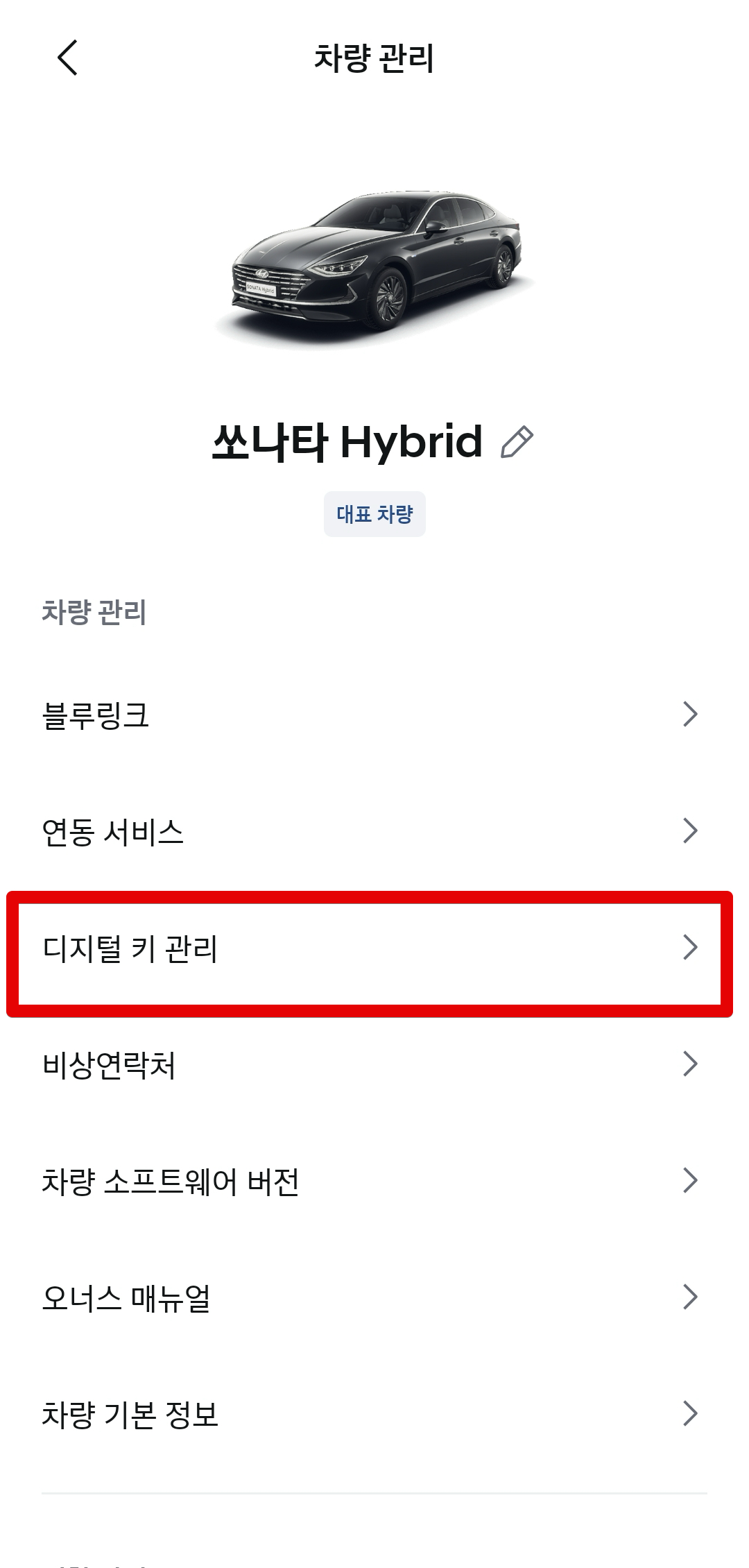 암튼 들어가게되면 소유한 차량들이 보이고 디지털키 등록할 차량을 클릭한 후 <디지털 키 관리>로 들어간다.