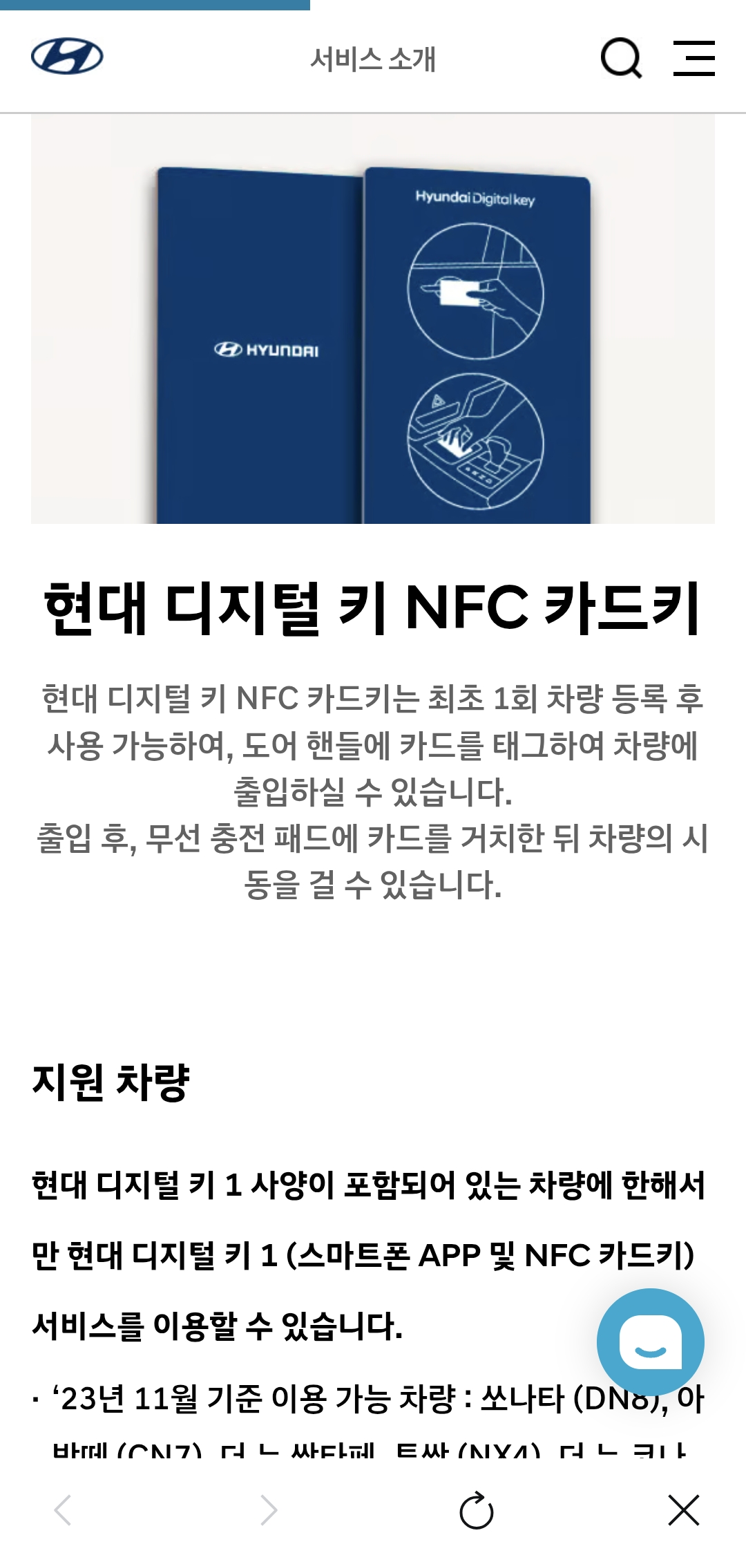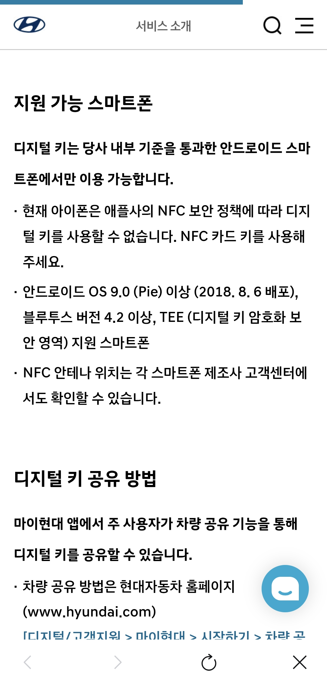 마이현대 앱 디지털키와 NFC카드 키 등을 간단하게 안내해주고 지원 차량 목록과 지원 가능 스마트폰도 볼 수 있다. 아이폰은 NFC 정책 때문에 이거 못쓴다... 그래서 예전에 이거 때문에라도 아이폰에서 갤럭시로 바꿨던 기억이 있다. 근데 지금은 아이폰보다 갤럭시가 더 좋다 ㅎㅎ