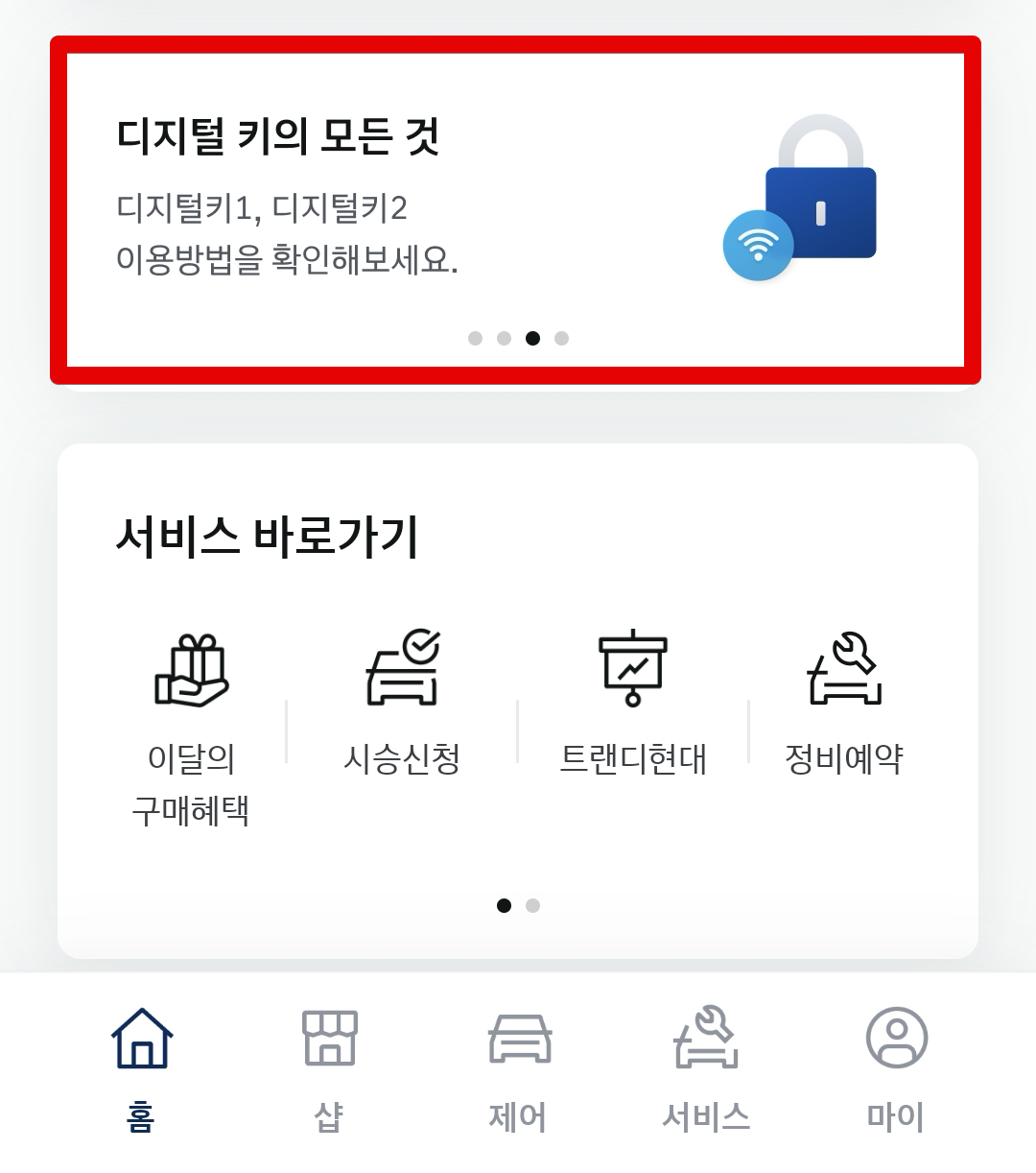 마이현대 앱에서 <홈> 메뉴에서 스크롤을 밑으로 죽 내려서 3번째 칸에 보면 디지털키의 모든것이라고해서 간단한 안내를 해주는게 있다.