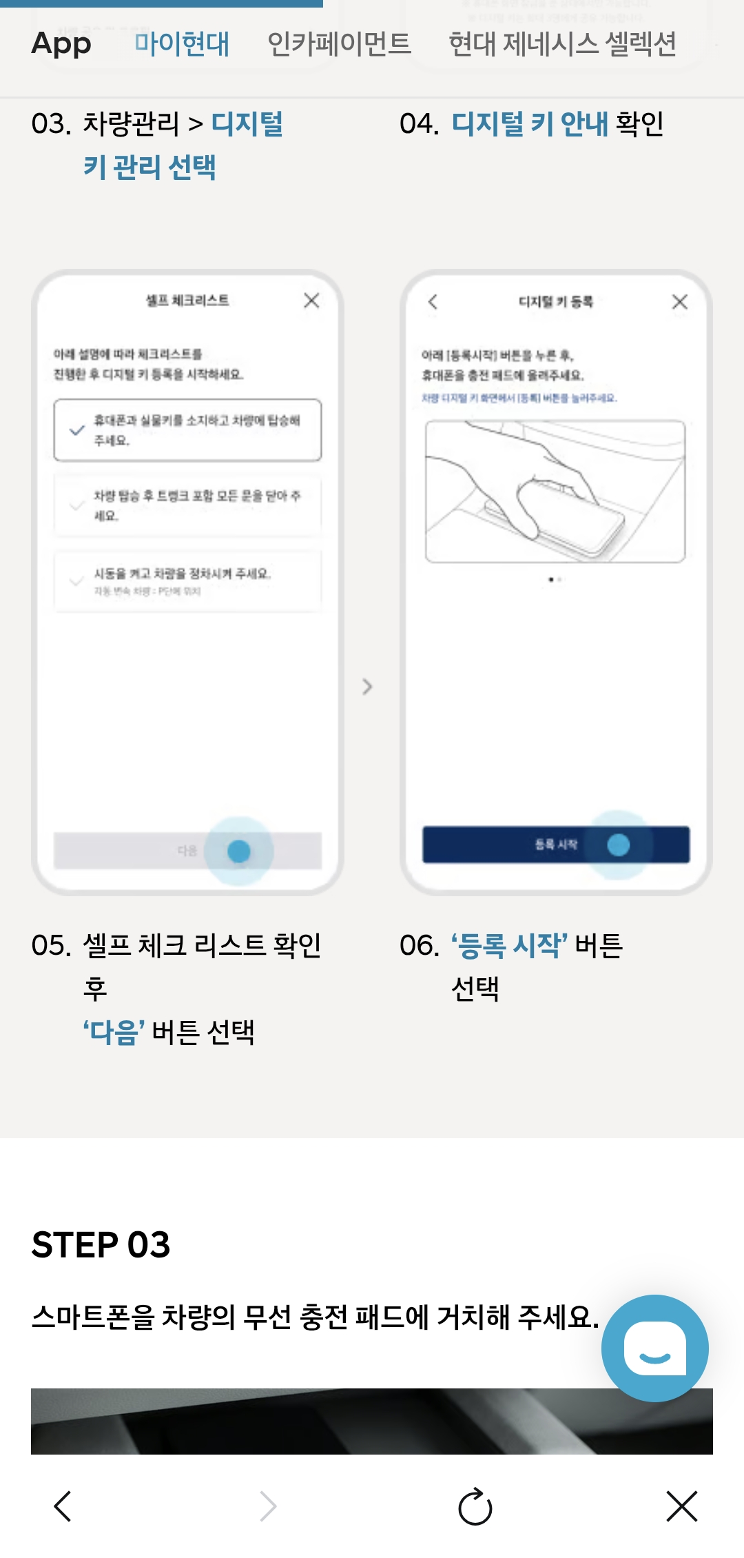 폰이 바뀌면서 기존에 사용하던 디지털 키와 폰이 달라졌다. 디지털 키는 한 대의 기기에서만 사용이 가능하다고 한다. 그래서 초기화를 먼저 해준다. 다음으로 디지털 키 등록을 진행해준다. 셀프 체크리스트가 나오는데 여기에 보면 스마트 키 2개를 모두 소지하고 차로 가야한다고 명시돼 있다. 1개만 있을 경우 오류가 난다는 후기가 있었다.